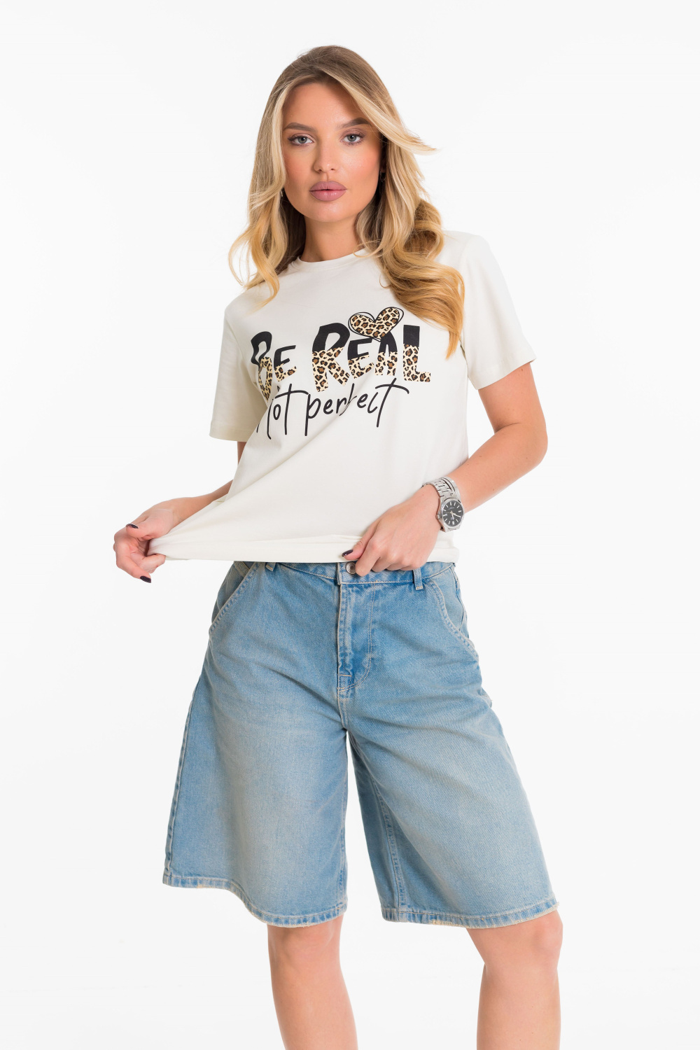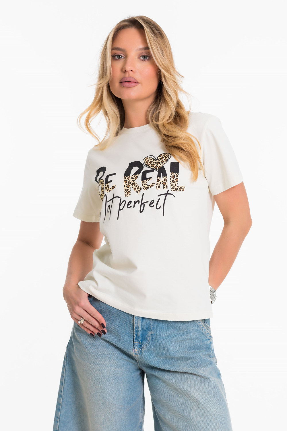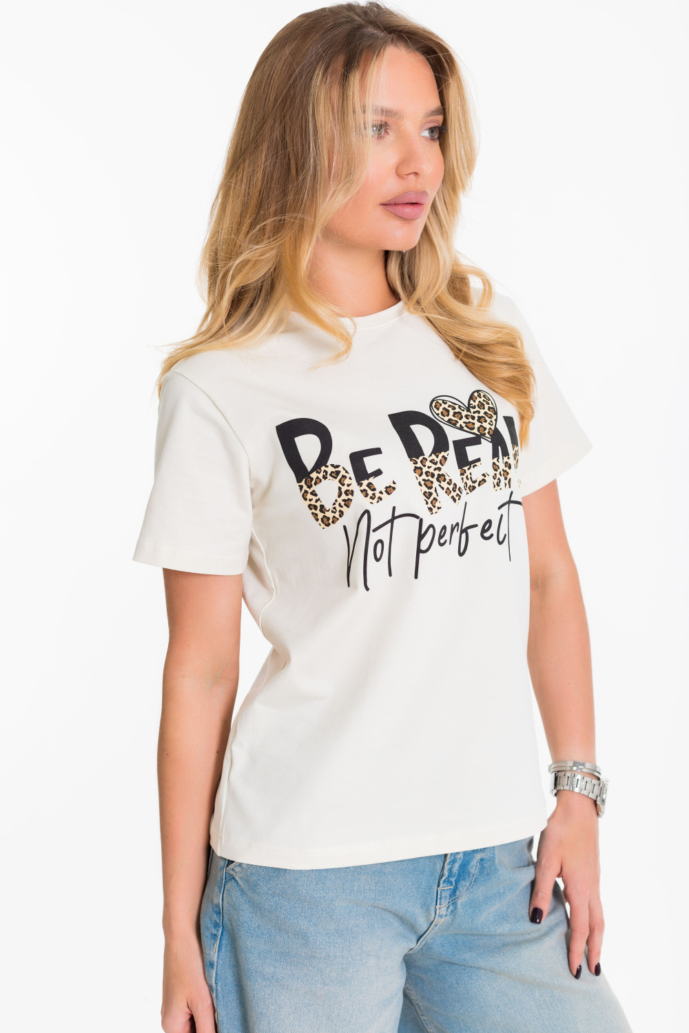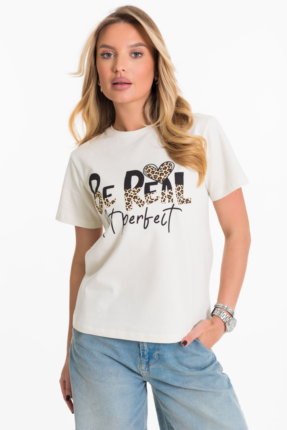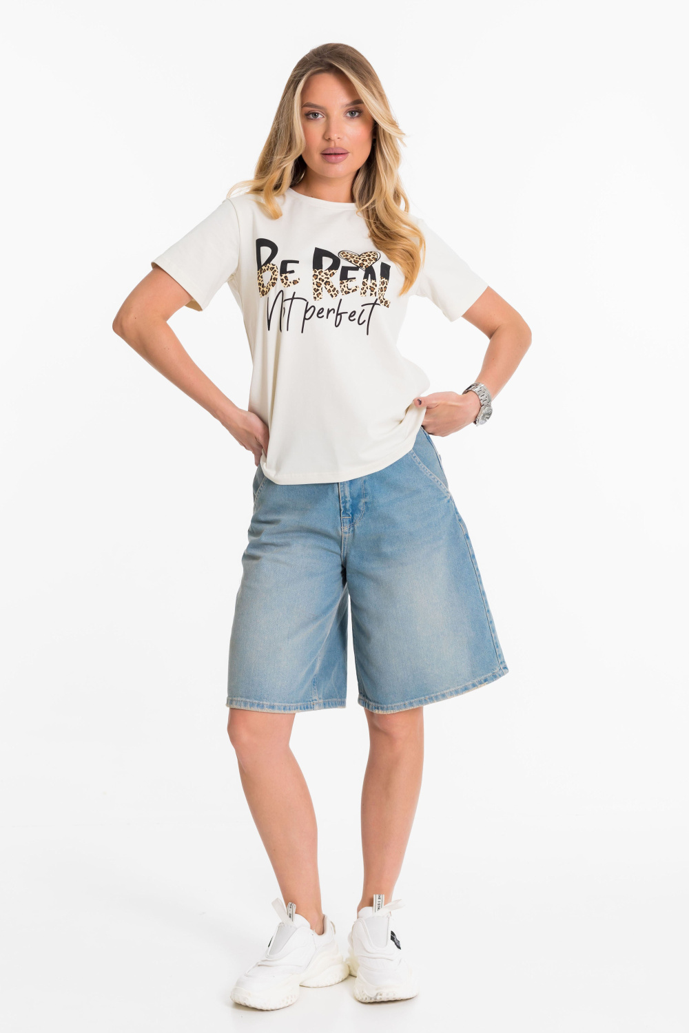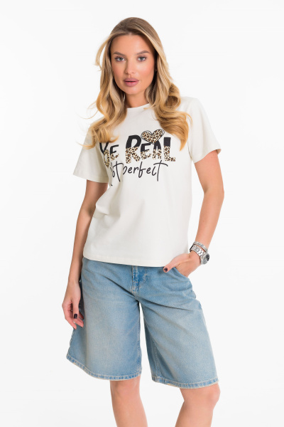 Женская футболка из лёгкой и приятной к телу ткани — отличный выбор для повседневного гардероба. Изготовлена из кулирки с лайкрой молочного цвета, имеет свободный силуэт и круглый вырез горловины. Спереди нанесен оригинальный принт. Футболка идеально подойдёт для отдыха или домашней носки.