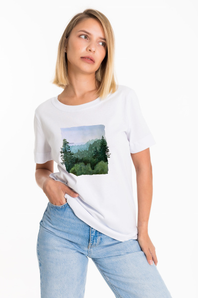 Футболка из однотонной кулирки, 100% хлопок. С коротким втачным рукавом и притачной планкой по горловине. Спереди нанесён принт.