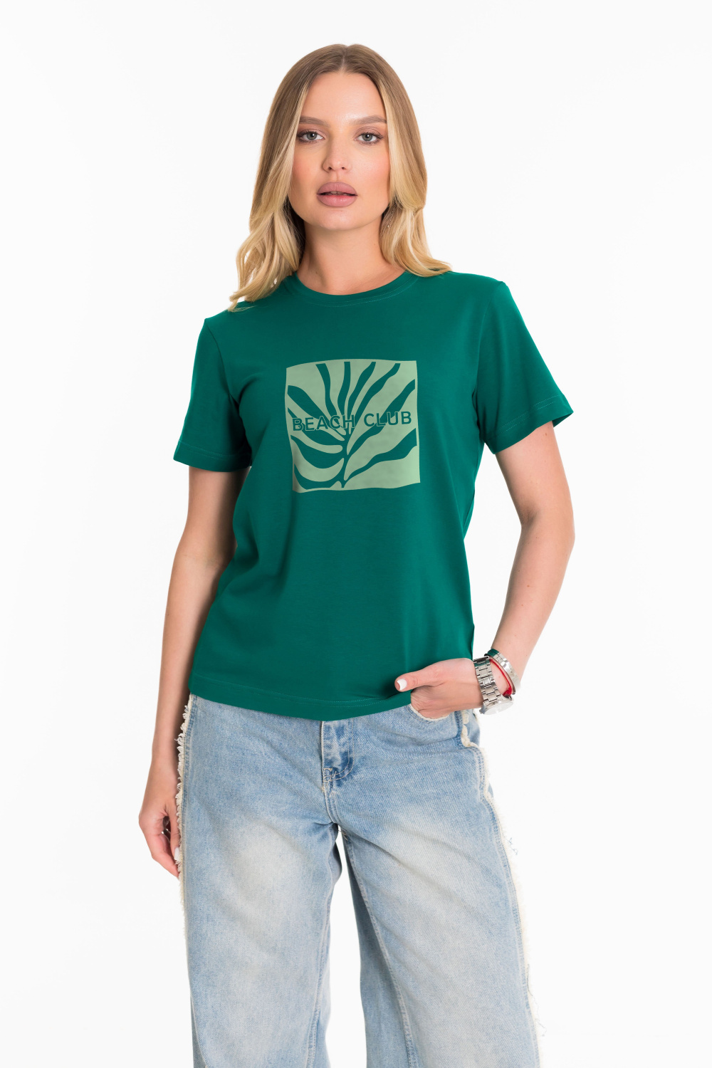 Женская футболка с принтом спереди изготовлена из хлопкового полотна с добавлением лайкры. Футболка с коротким втачным рукавом и круглым вырезом горловины, что придает ей классический стильный вид. Такая модель футболки отлично сочетается с джинсами, брюками или юбкой. Изготовленная из натуральной ткани, футболка обеспечит комфорт в течение всего дня.