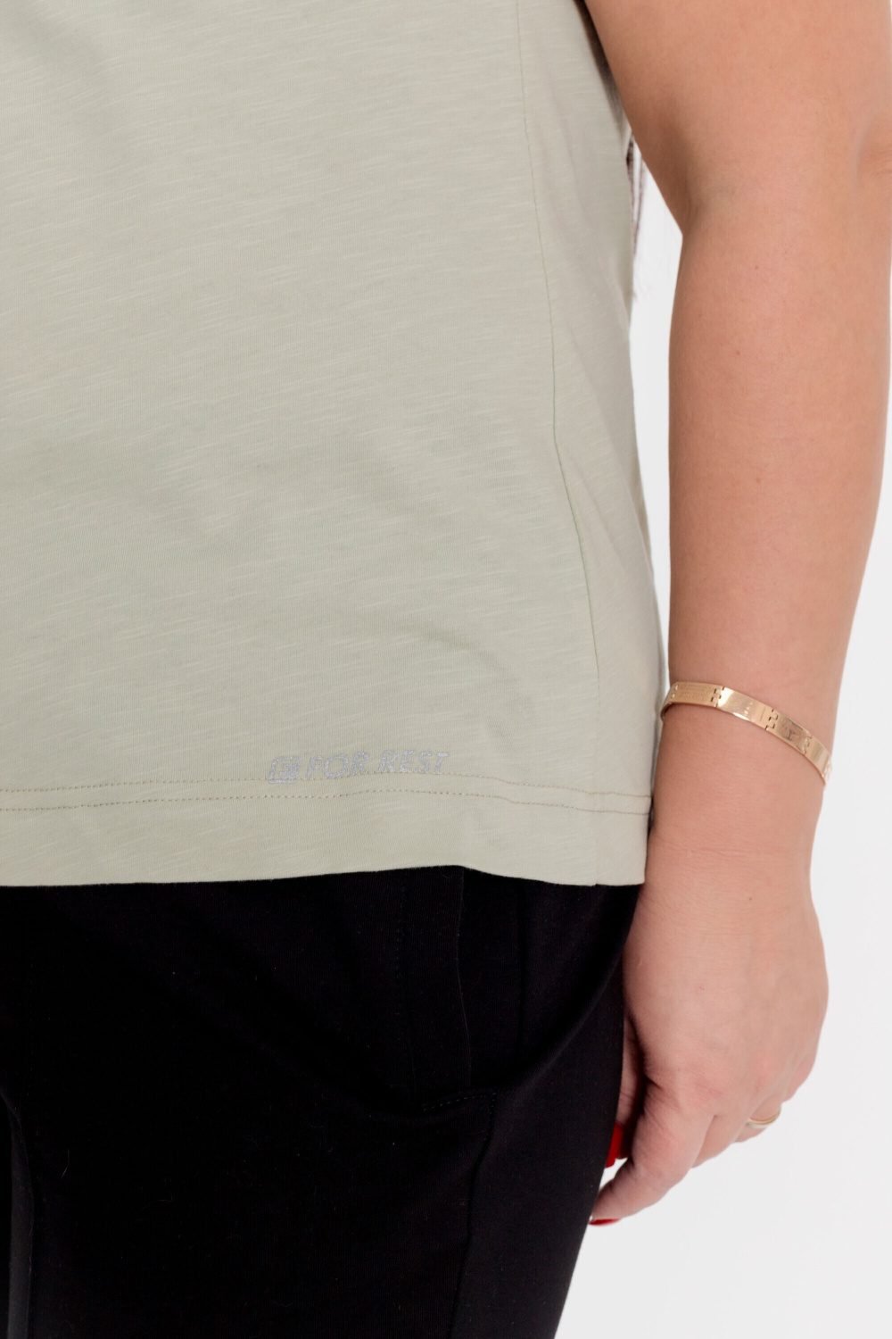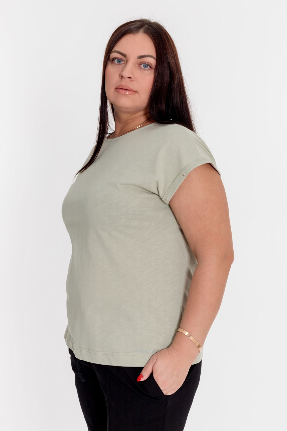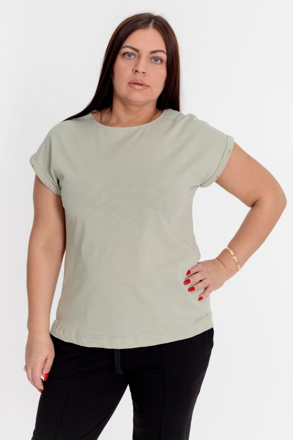 Футболка выполнена из однотонного полотна кулирка фламли. Горловина с круглым вырезом, короткие цельнокроеные рукава с отворотами, украшенными металлическими хольнитенами. Внизу, спереди нанесён принт.