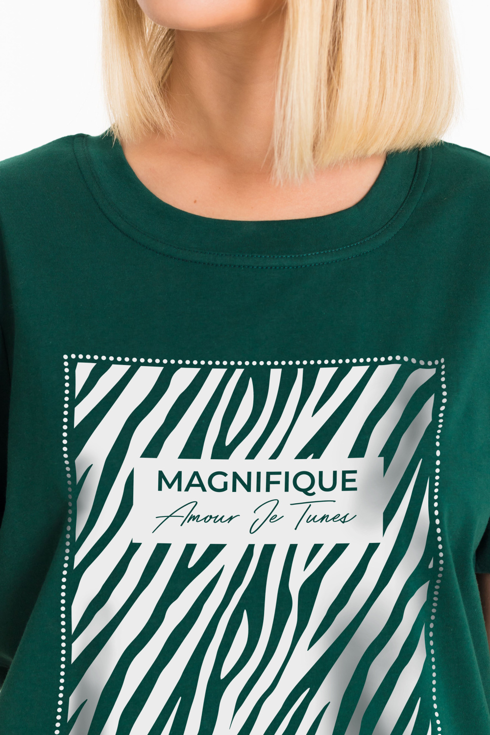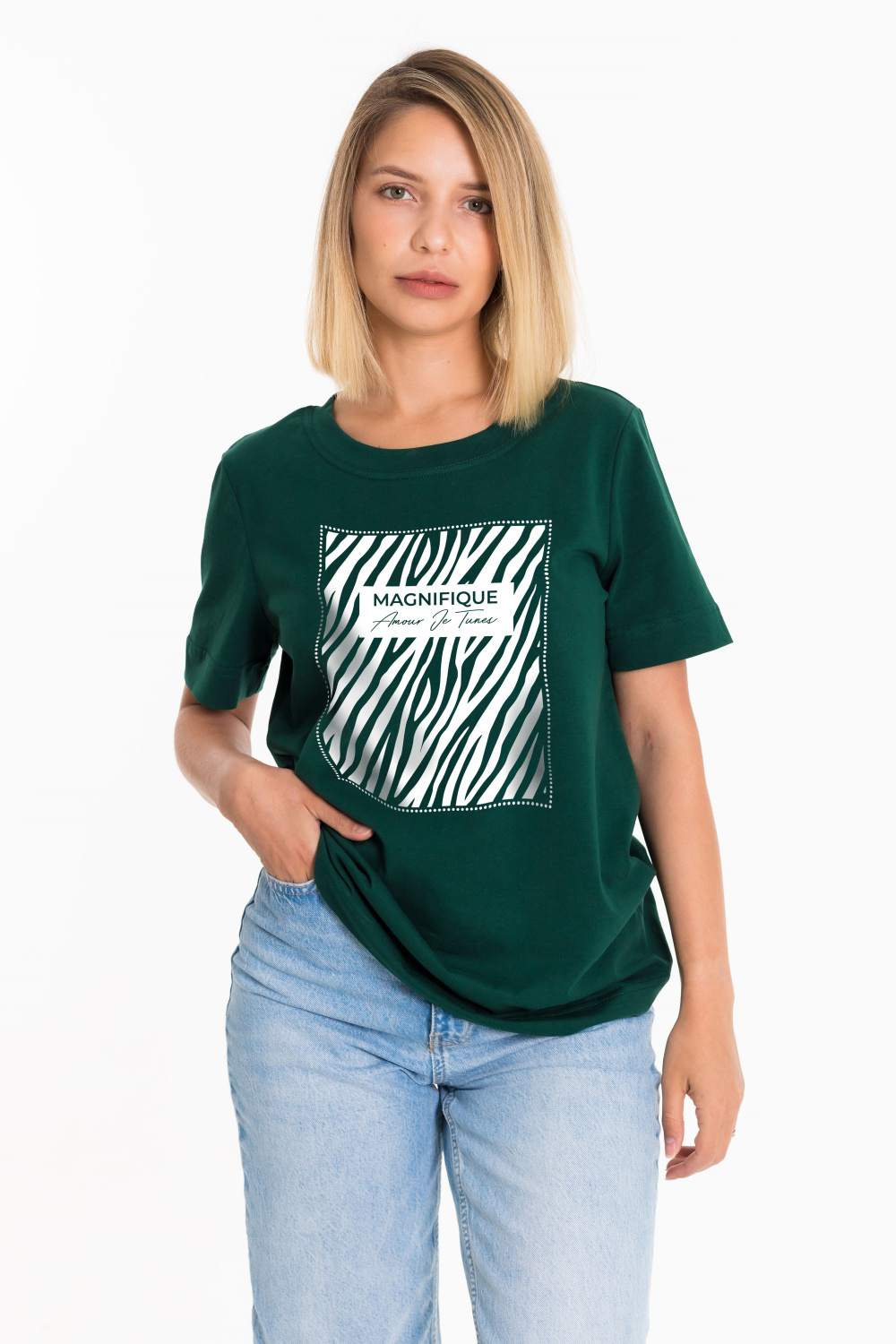 Футболка из однотонной кулирки, 100% хлопок. С коротким втачным рукавом и притачной планкой по горловине. Спереди нанесён принт.