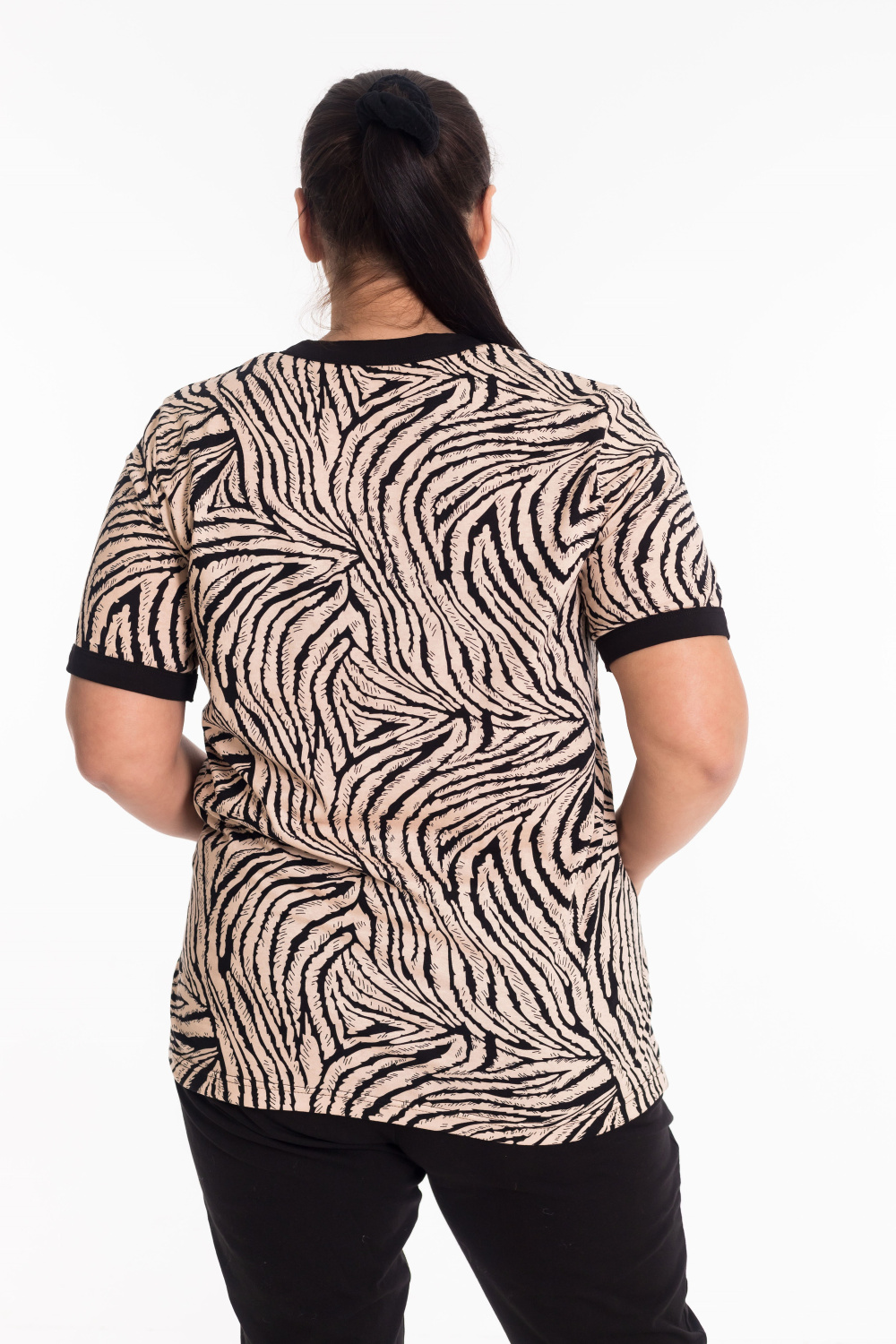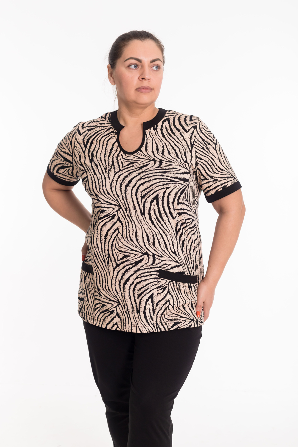 Женская футболка выполнена из кулирки, 100% хлопок. Вырез горловины фигурный, низ рукавов и карманы с контрастной отделкой.