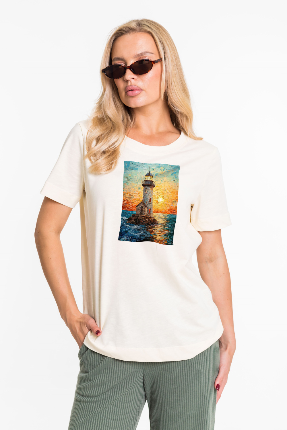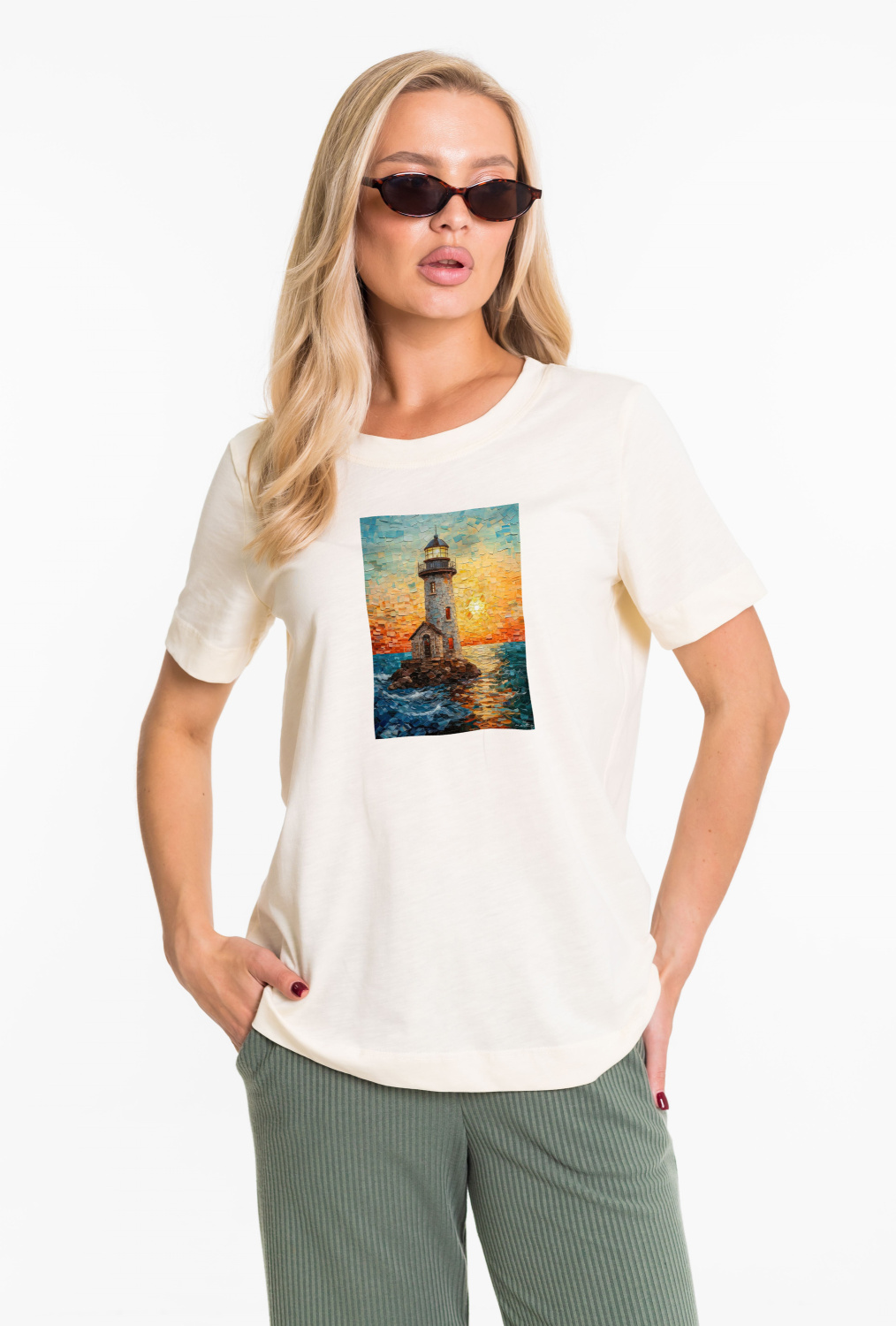 Женская футболка с принтом спереди изготовлена из хлопкового полотна. Футболка с коротким втачным рукавом и круглым вырезом горловины, что придает ей классический стильный вид. Такая модель футболки отлично сочетается с джинсами, брюками или юбкой. Изготовленная из натуральной ткани, футболка обеспечит комфорт в течение всего дня.