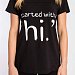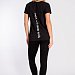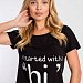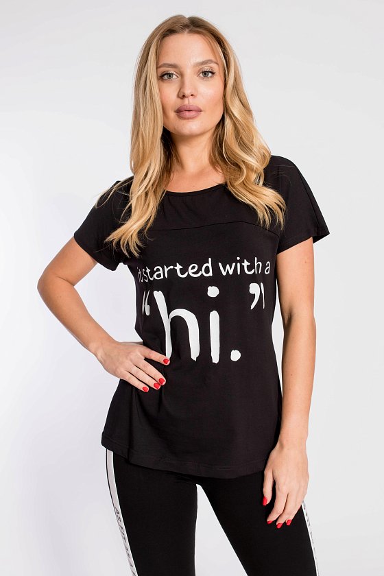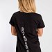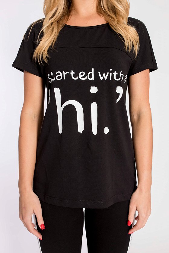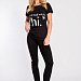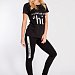 Футболка с цельнокроеным рукавом из полотна х/б с лайкрой. Горловина обработана бейкой. Низ изделия и рукавов подшиты плоским эластичным стежком. Спереди и сзади расположены принты.