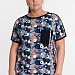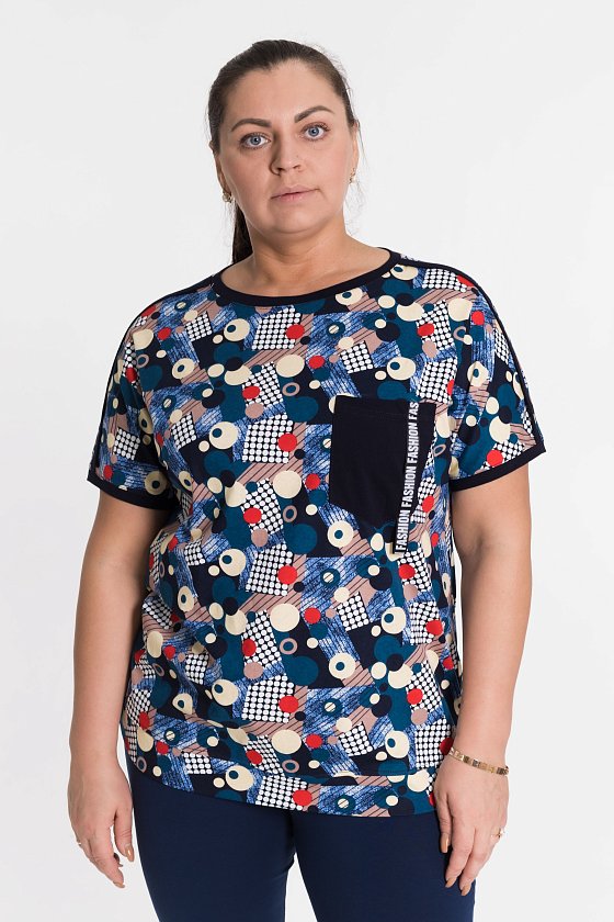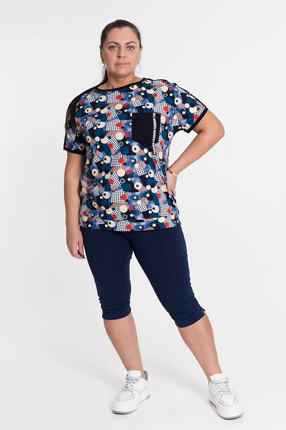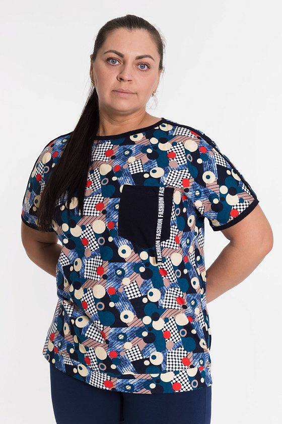 Футболка выполнена из х/б полотна с набивным рисунком. Силуэт свободный, вырез горловины округлый. Спереди размещён нагрудный карман.
