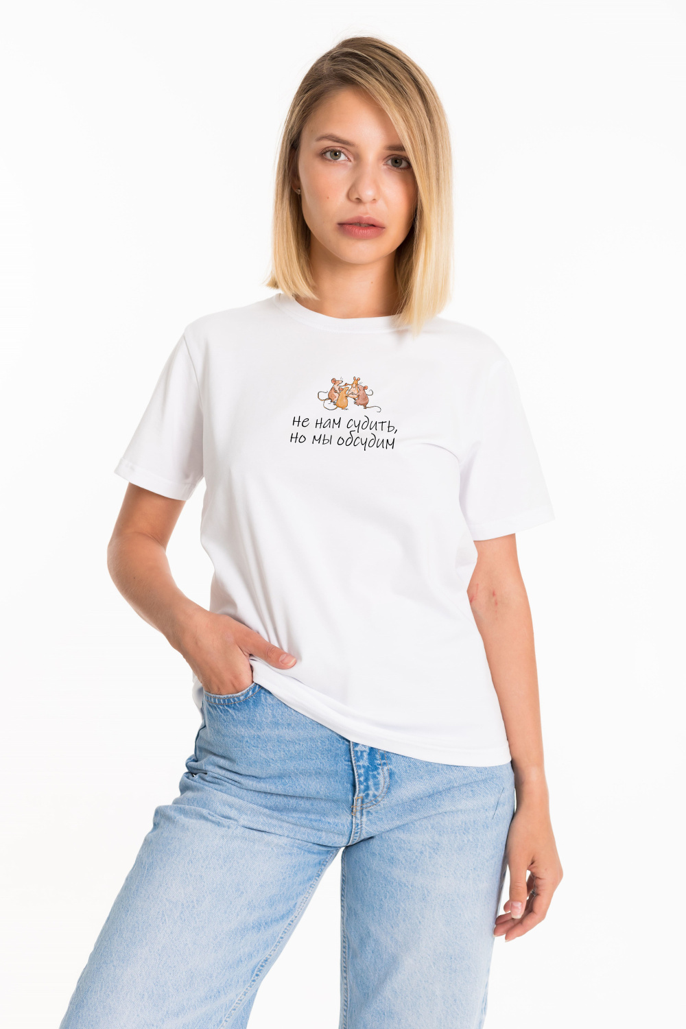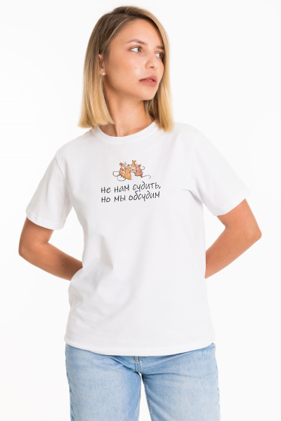 Женская футболка с принтом спереди изготовлена из хлопкового полотна с добавлением лайкры. Футболка с коротким втачным рукавом и круглым вырезом горловины, что придает ей классический стильный вид. Такая модель футболки отлично сочетается с джинсами, брюками или юбкой. Изготовленная из натуральной ткани, футболка обеспечит комфорт в течение всего дня.