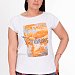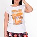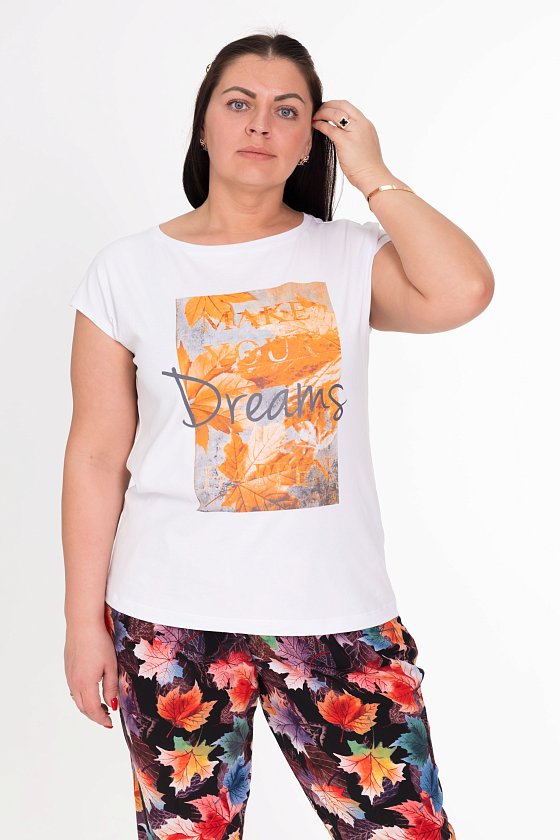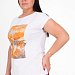Футболка из однотонной кулирки с лайкрой. Спущенное плечо, горловина лодочка. На полочке принт.