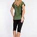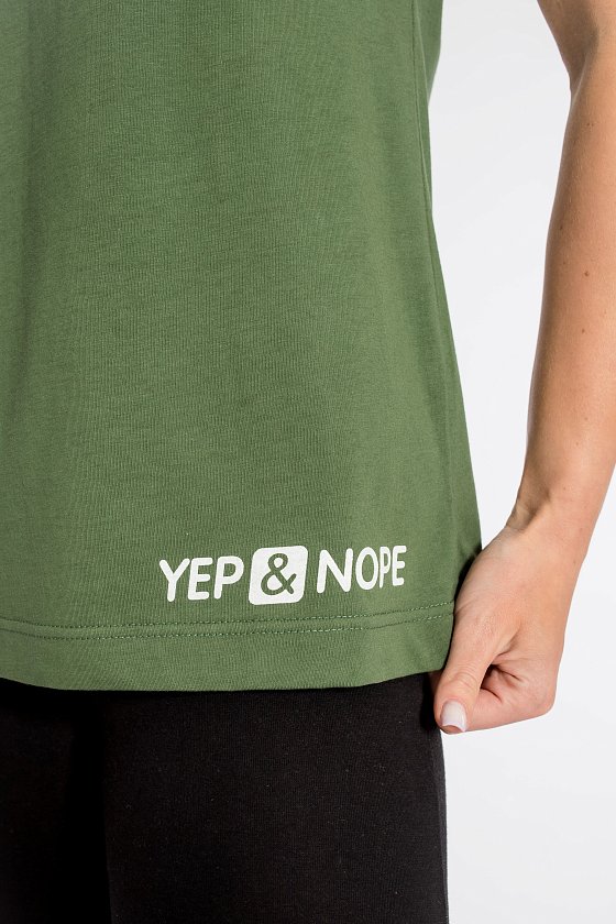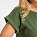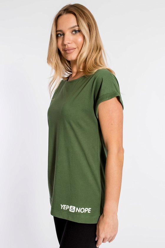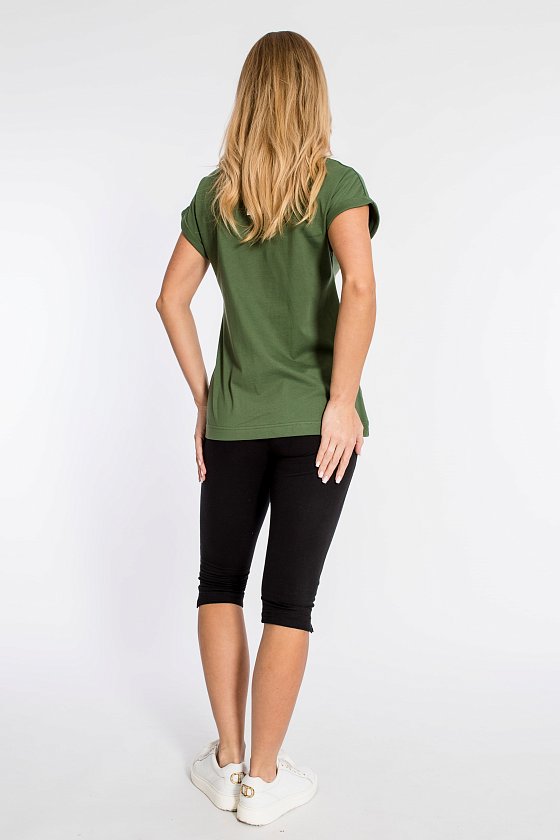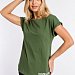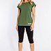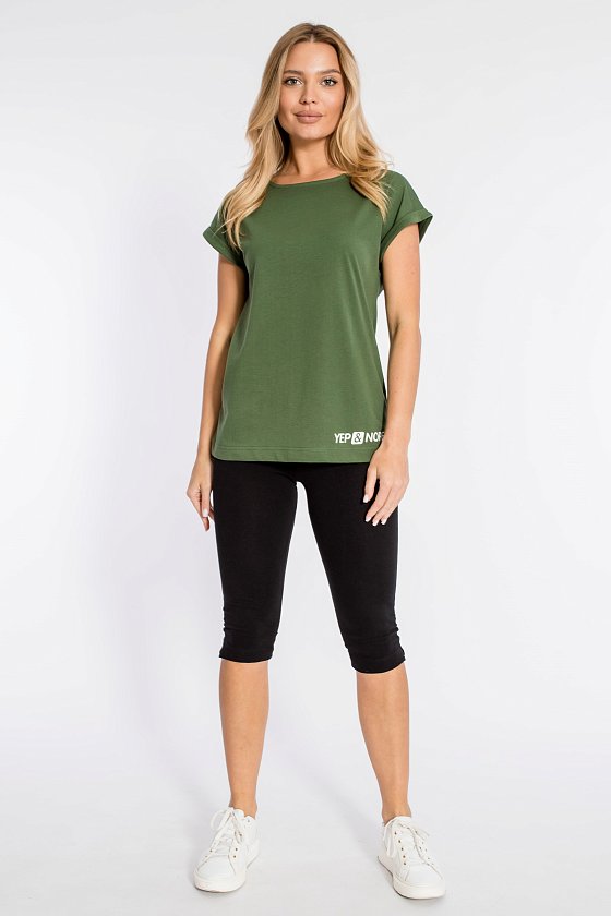 Женская футболка из кулирки — отличный выбор для повседневной носки. Изготовленная из мягкой и приятной к телу ткани, она обеспечивает комфорт в течение дня. Круглый вырез горловины и короткие цельнокроеные рукава с отворотами придают изделию аккуратный вид. Наличие принта спереди добавляет футболке оригинальности. Однотонный цвет хаки позволяет сочетать её с различными элементами гардероба. Футболка подойдёт для прогулок, неформальных встреч или отдыха.