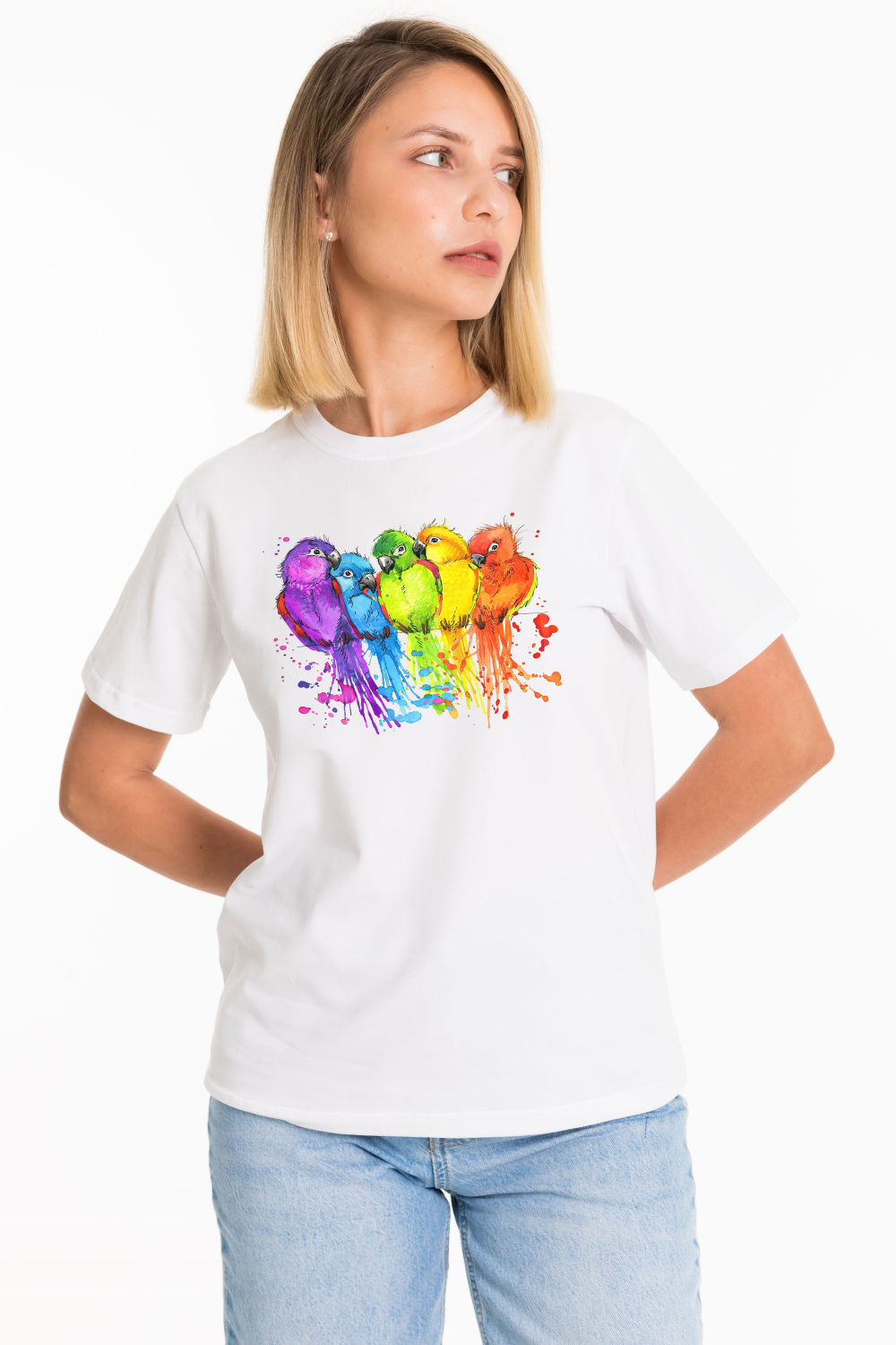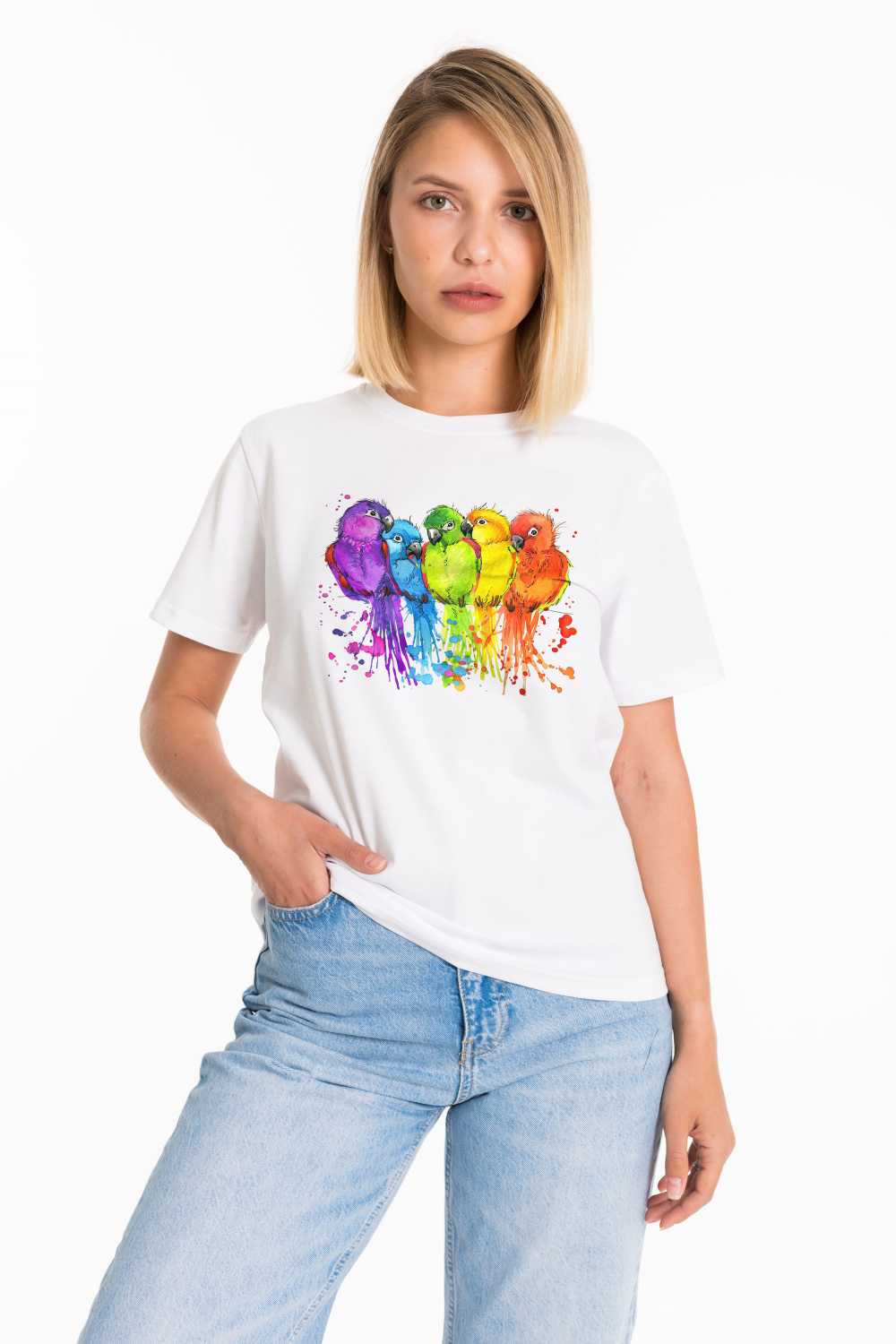 Женская футболка с принтом спереди изготовлена из хлопкового полотна с добавлением лайкры. Футболка с коротким втачным рукавом и круглым вырезом горловины, что придает ей классический стильный вид. Такая модель футболки отлично сочетается с джинсами, брюками или юбкой. Изготовленная из натуральной ткани, футболка обеспечит комфорт в течение всего дня.