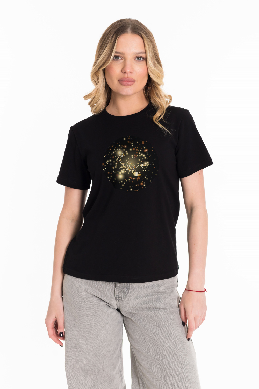 Женская футболка с принтом изготовлена из хлопкового полотна с добавлением лайкры, что обеспечивает комфорт и хорошую воздухопроницаемость. Футболка имеет короткий рукав и круглый вырез горловины, что придает ей классический стильный вид. Такая модель футболки отлично сочетается с джинсами, брюками или юбкой. Изготовленная из натуральной ткани, футболка обеспечит комфорт в течение всего дня.