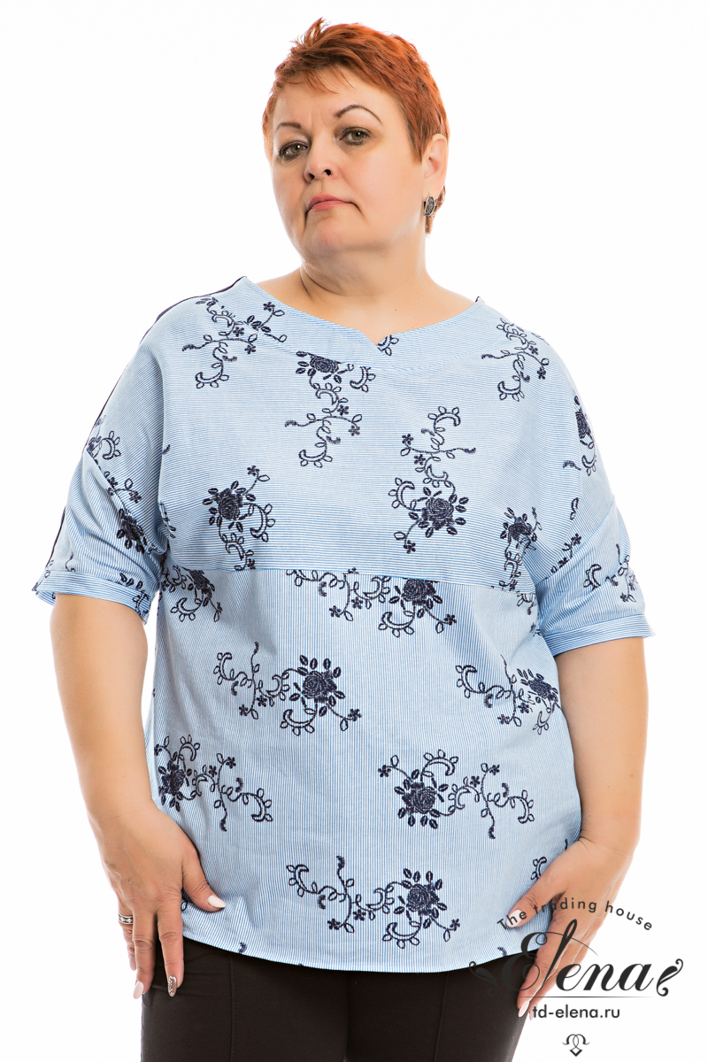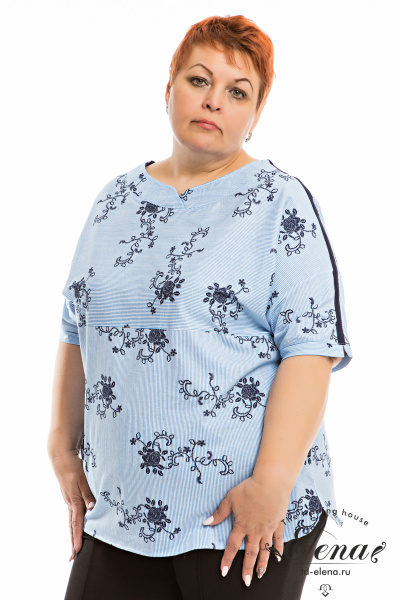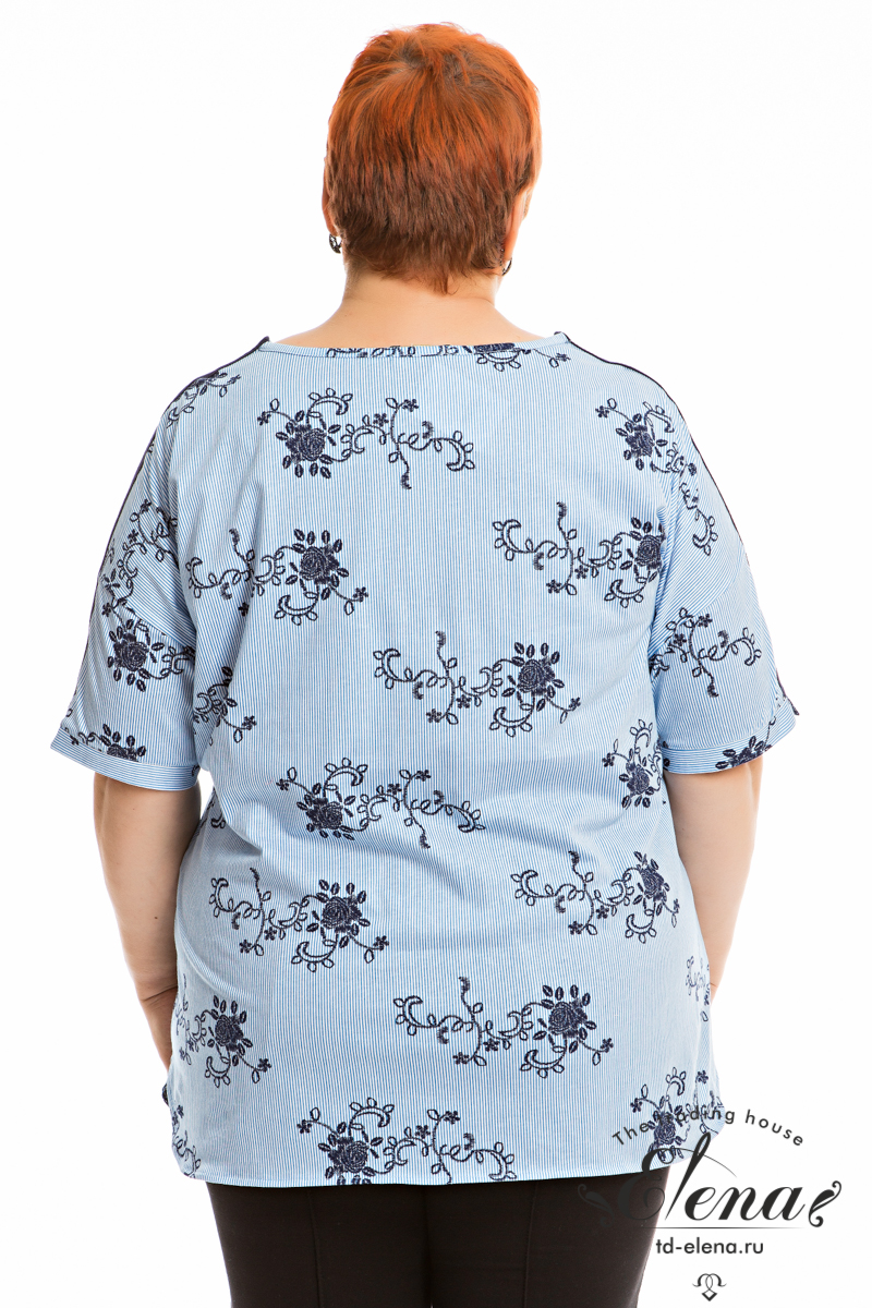Футболка выполнена из хлопкового полотна. Вырез горловины округлый, линия плеча спущенная, рукав украшен киперной лентой и декоративным разрезом снизу. Низ изделия с закруглениями к боковым швам.
