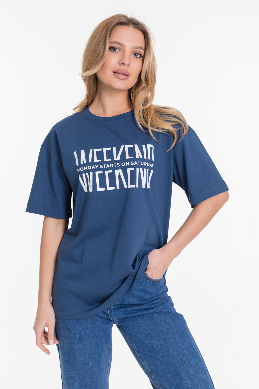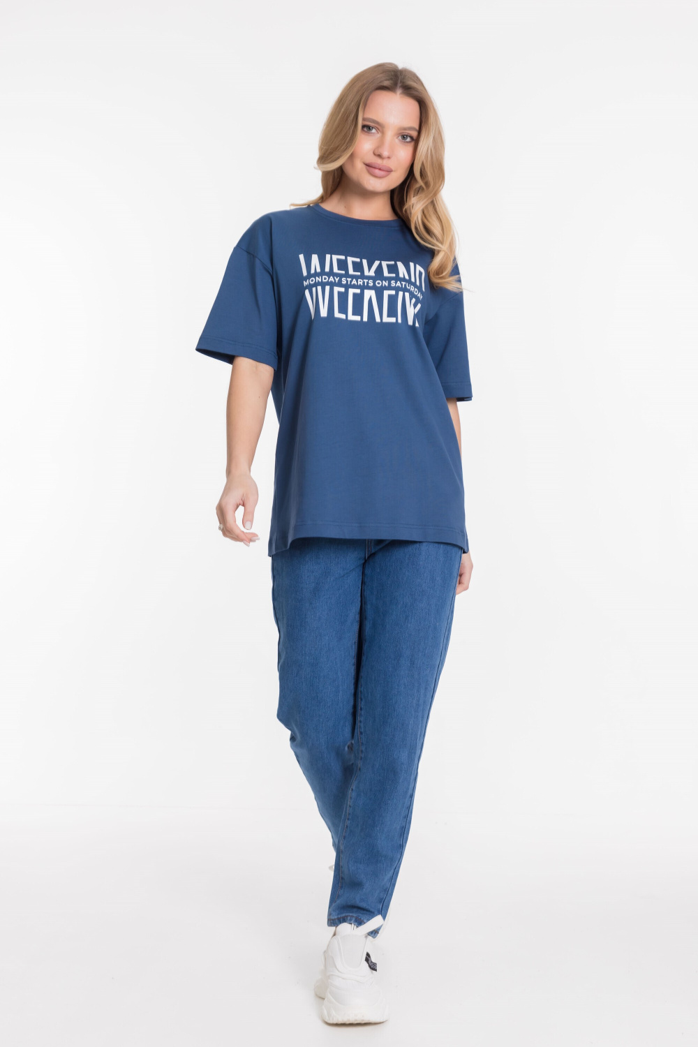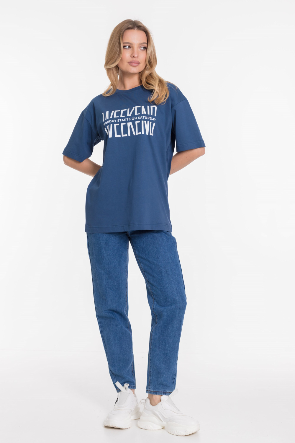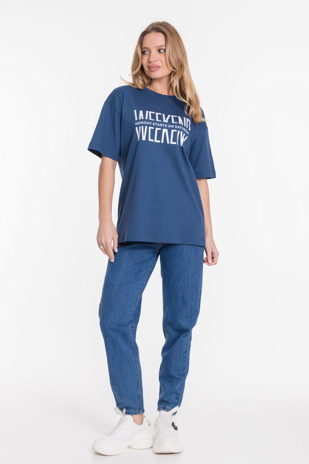 Футболка оверсайз силуэта из однотонной кулирки, 100% хлопок. С коротким рукавом и круглым вырезом горловины, оформленным планкой. Спереди нанесён принт.