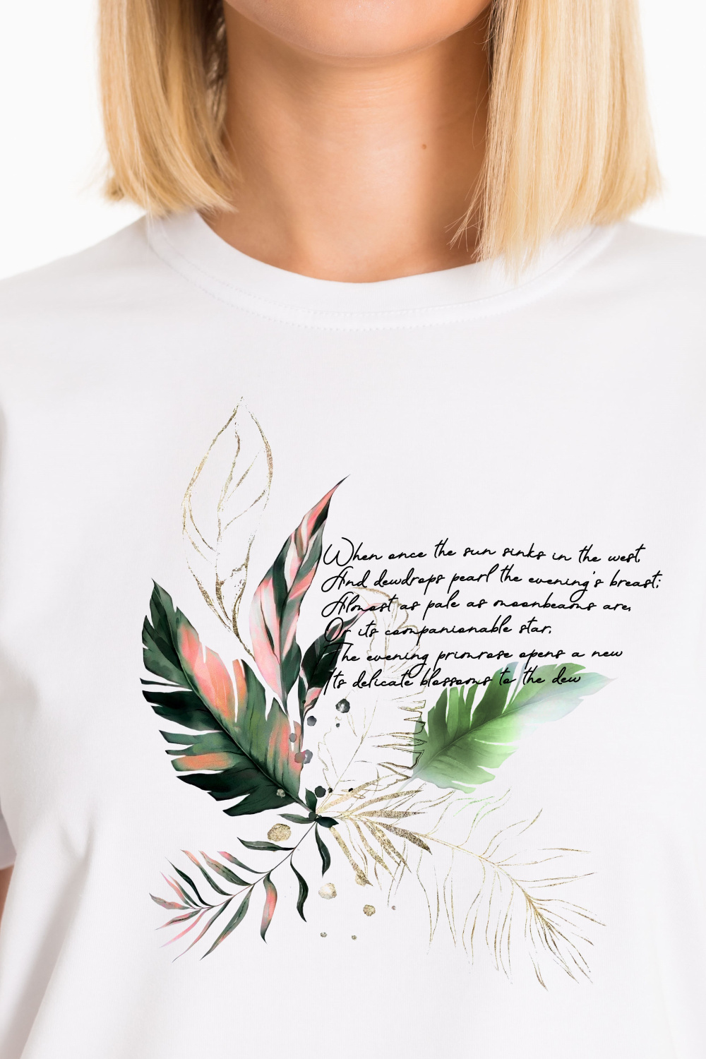 Женская футболка с принтом спереди изготовлена из хлопкового полотна с добавлением лайкры. Футболка с коротким втачным рукавом и круглым вырезом горловины, что придает ей классический стильный вид. Такая модель футболки отлично сочетается с джинсами, брюками или юбкой. Изготовленная из натуральной ткани, футболка обеспечит комфорт в течение всего дня.