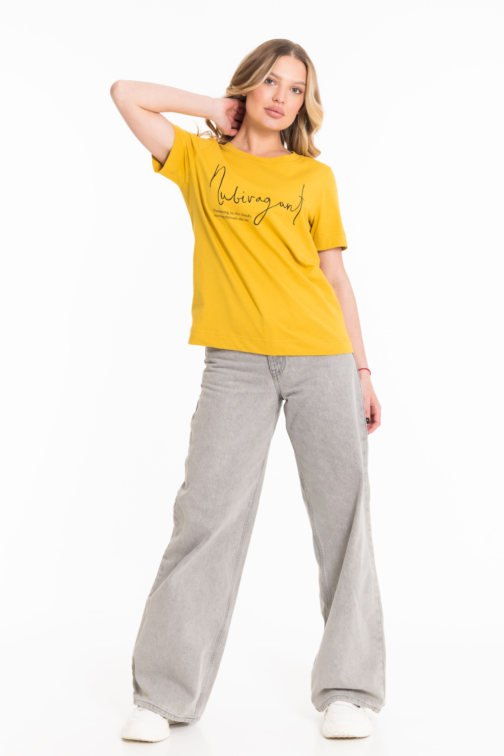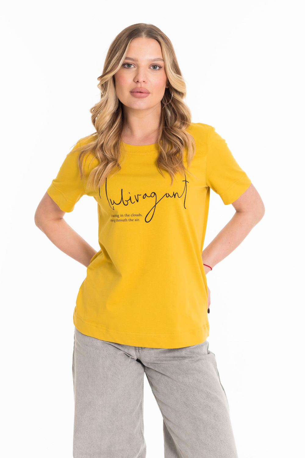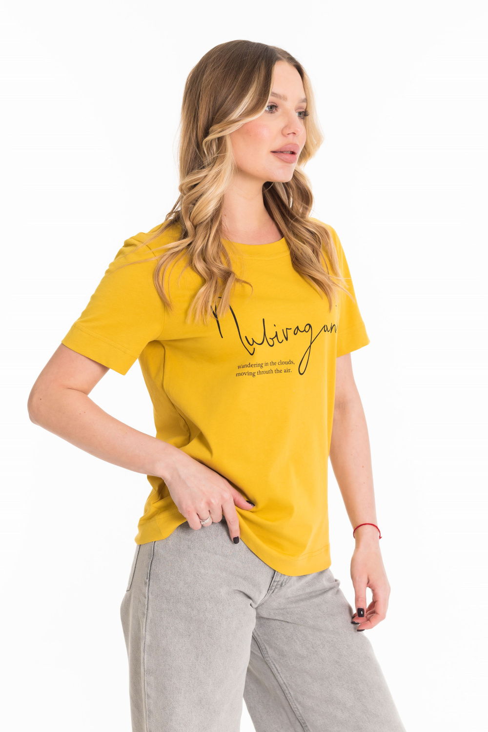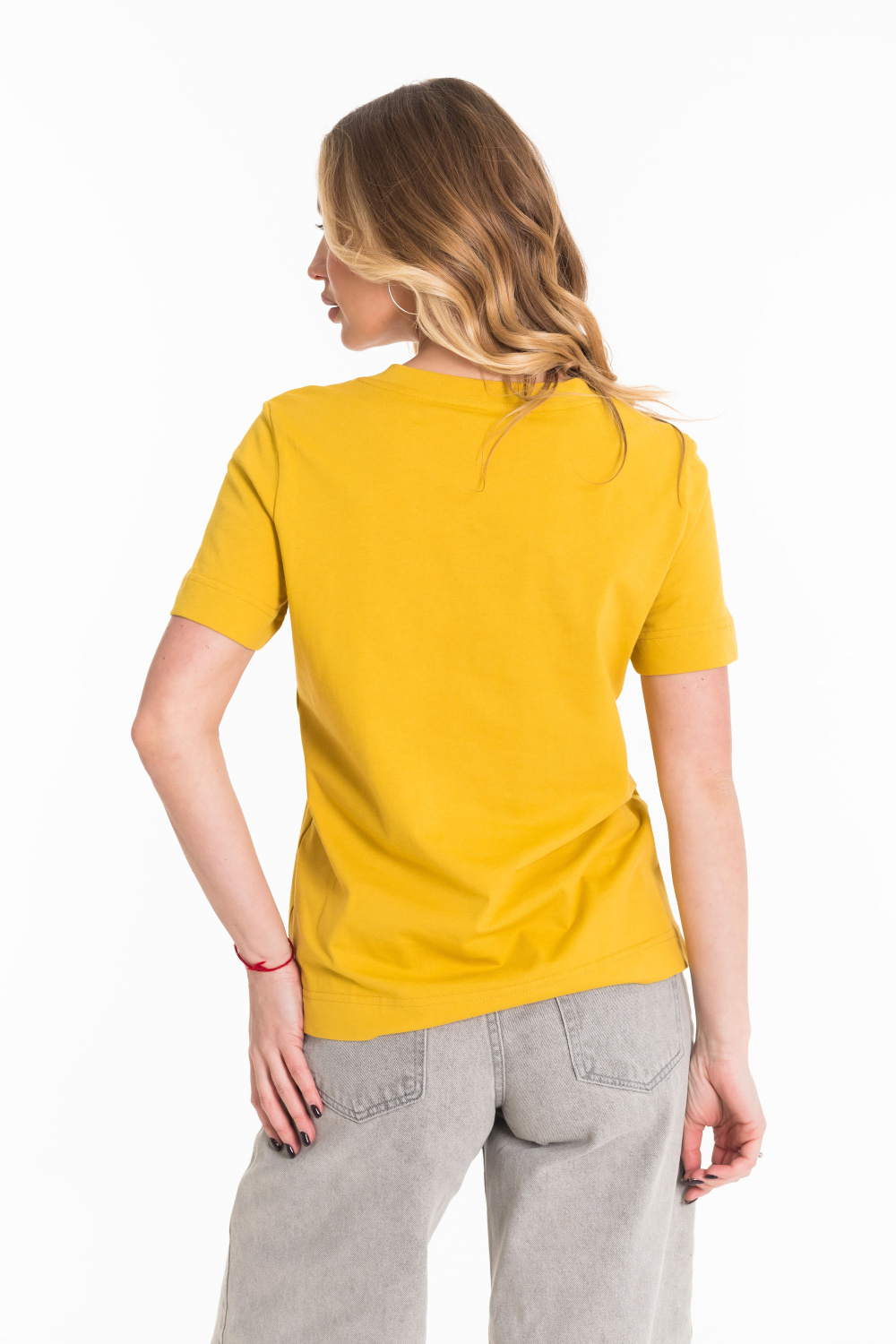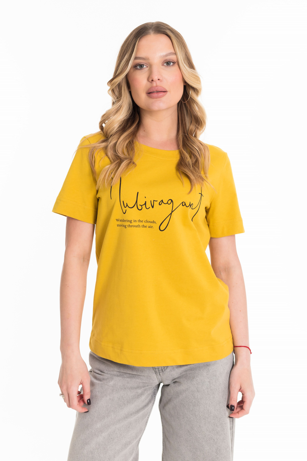 Футболка из однотонной кулирки, 100% хлопок. С коротким втачным рукавом и притачной планкой по круглому вырезу горловины. На полочке принт.
