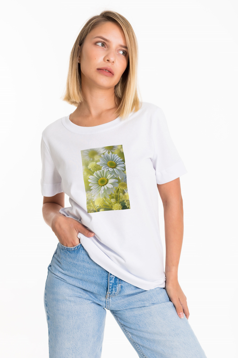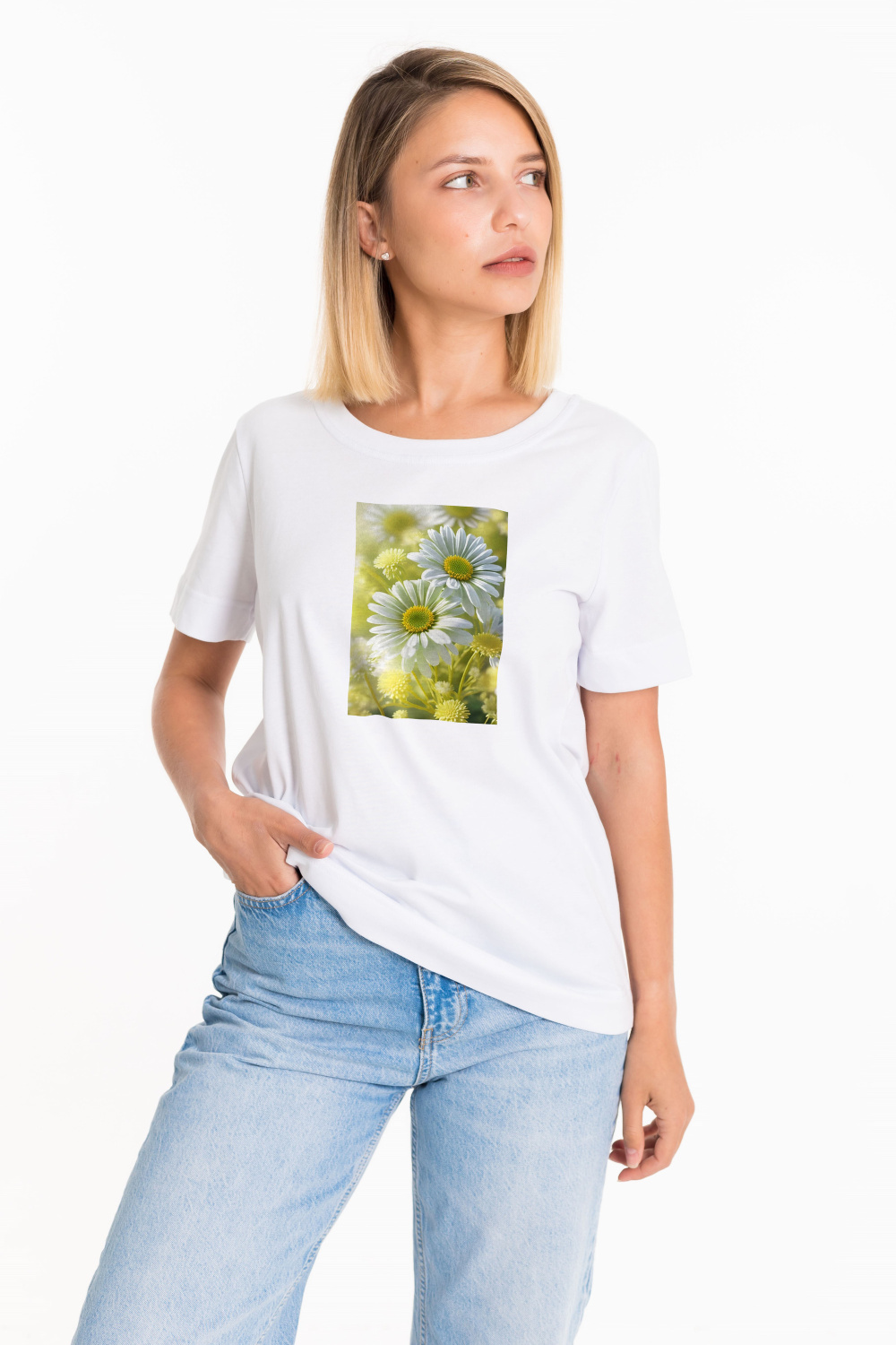 Женская футболка с принтом изготовлена из хлопкового полотна - что обеспечивает комфорт и хорошую воздухопроницаемость. Футболка имеет короткий рукав и круглый вырез горловины, что придает ей классический стильный вид. Такая модель футболки отлично сочетается с джинсами, брюками или юбкой. Изготовленная из натуральной ткани, футболка обеспечит комфорт в течение всего дня.