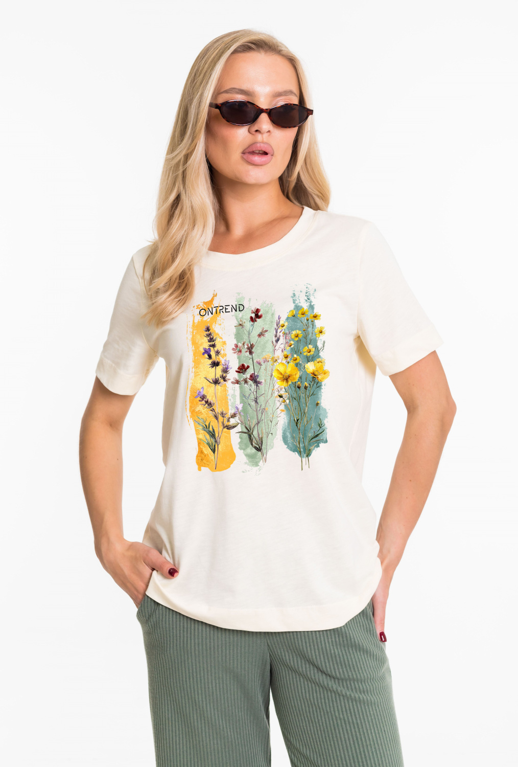 Женская футболка с принтом изготовлена из хлопкового полотна - кулирка "фламли", что обеспечивает комфорт и хорошую воздухопроницаемость. Футболка имеет короткий рукав и круглый вырез горловины, что придает ей классический стильный вид. Такая модель футболки отлично сочетается с джинсами, брюками или юбкой. Изготовленная из натуральной ткани, футболка обеспечит комфорт в течение всего дня.