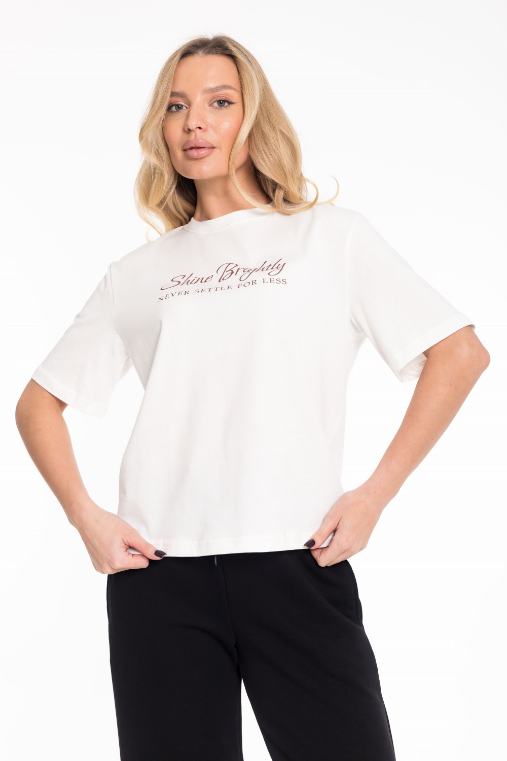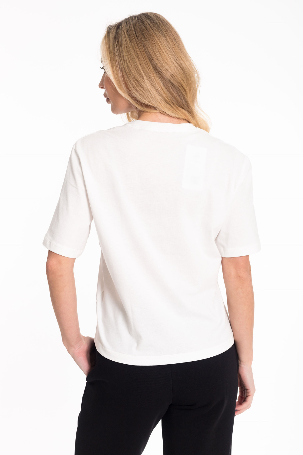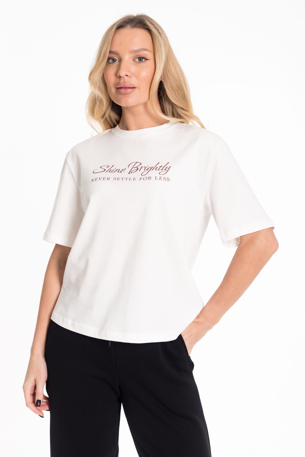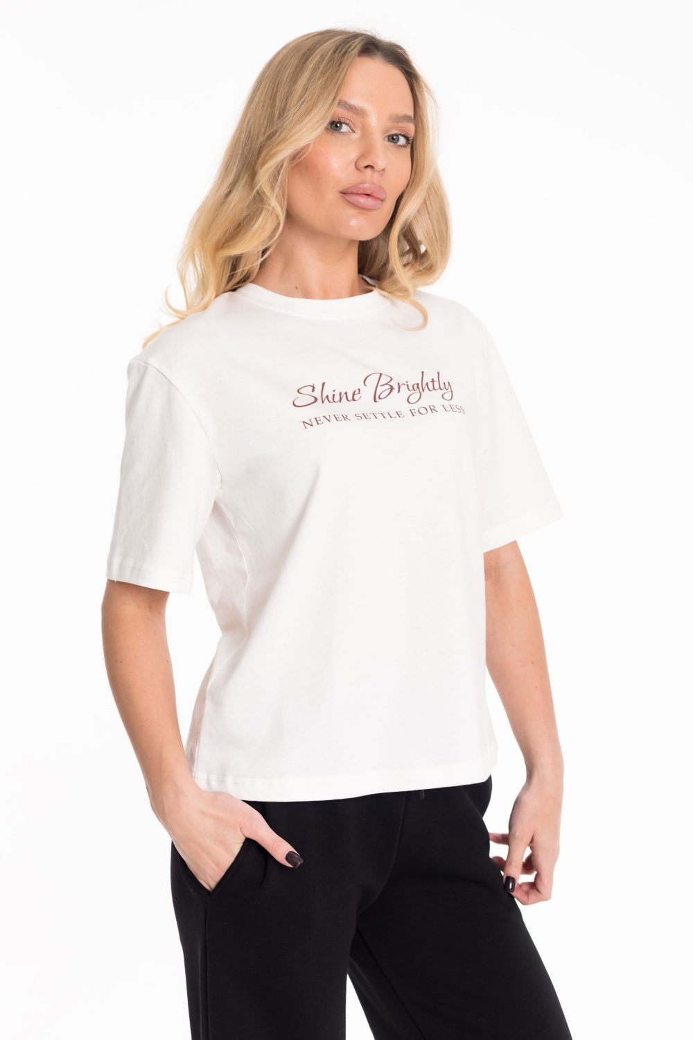 Женская футболка изготовлена из хлопкового полотна, что обеспечивает комфорт и отличную воздухопроницаемость. Модель выполнена в базовом молочном цвете, имеет короткий рукав и круглый вырез горловины, создавая лаконичный и стильный образ. Спереди украшена аккуратным принтом, добавляющим индивидуальности. Благодаря натуральной ткани футболка приятна к телу и подходит для носки в течение всего дня, легко сочетаясь с джинсами, брюками или юбкой.
