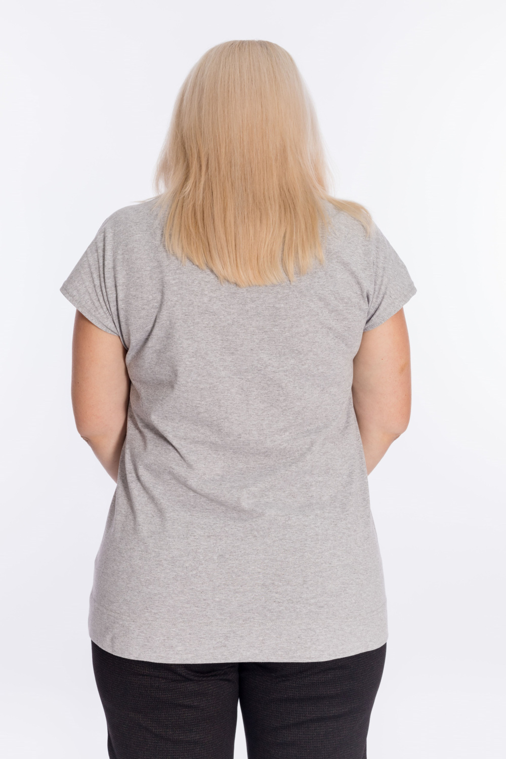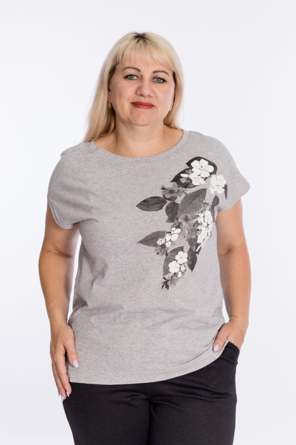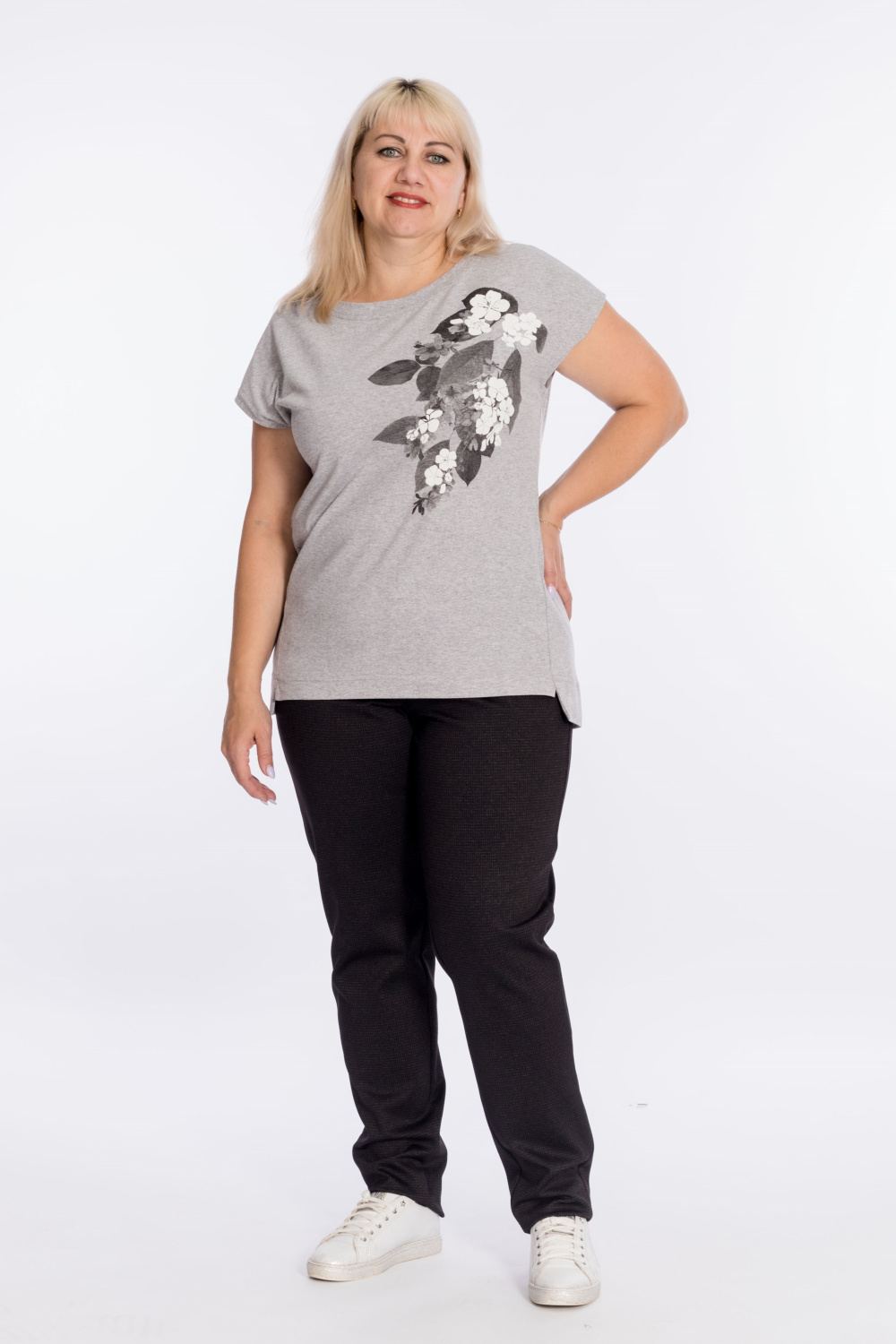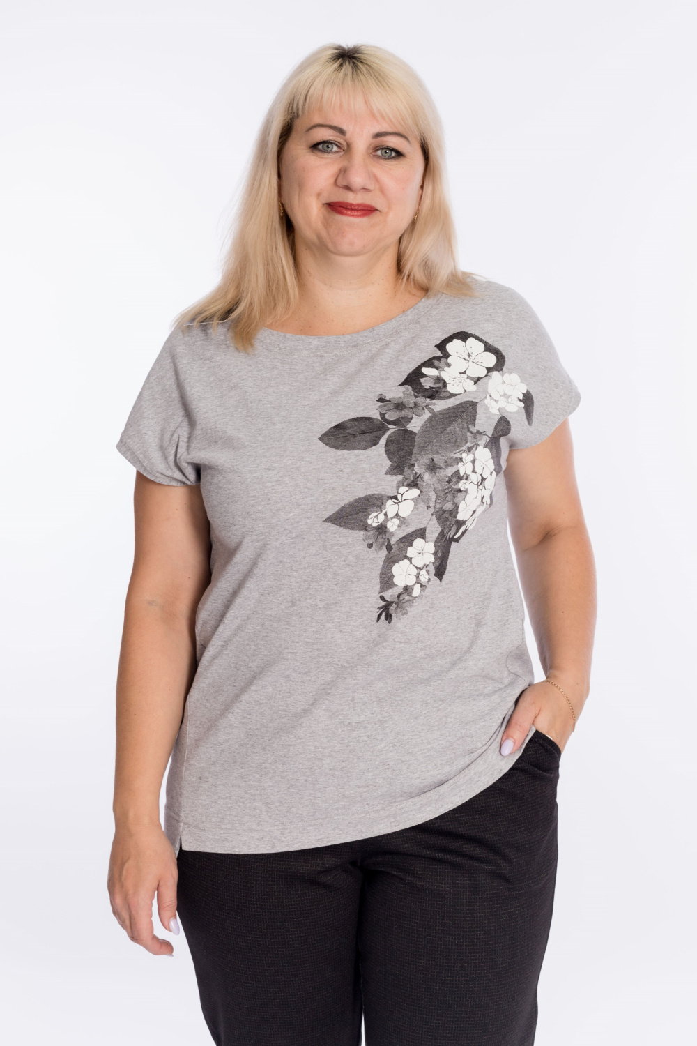 Футболка выполнена из кулирки. Горловина с круглым вырезом, линия плеча спущена. Низ изделия разноуровневый, оформлен разрезами. Спереди нанесён принт в виде цветов.