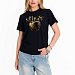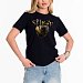 Женская футболка изготовлена из хлопкового полотна с добавлением лайкры, что обеспечивает комфорт и хорошую воздухопроницаемость. Футболка имеет короткий втачной рукав и круглый вырез горловины, что придает ей классический стильный вид. Такая модель базового черного цвета с оригинальным принтом на полочке отлично сочетается с джинсами, брюками или юбкой. Изготовленная из натуральной ткани, футболка обеспечит комфорт в течение всего дня.