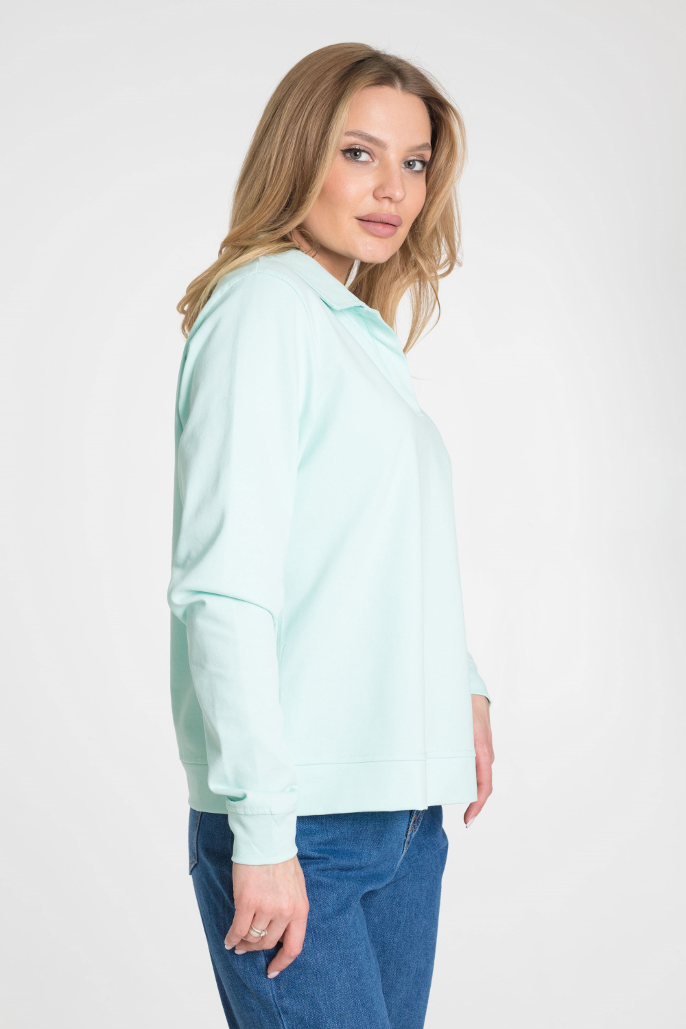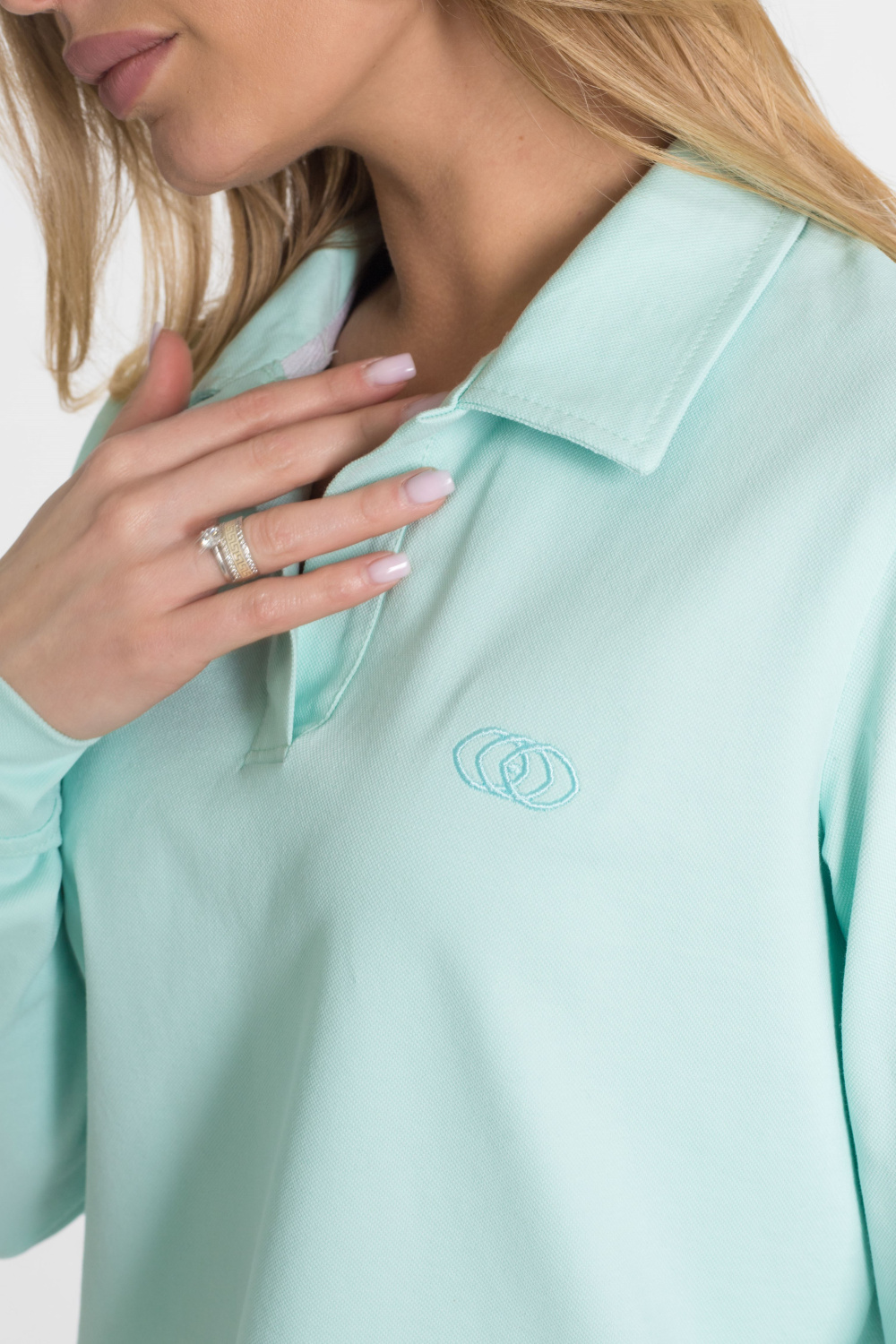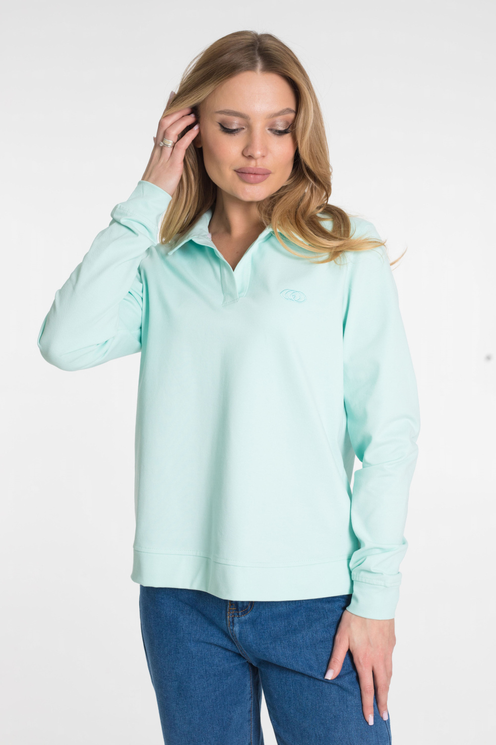 Футболка с длинным рукавом выполнена из полотна "пике" красивого ментолового цвета.