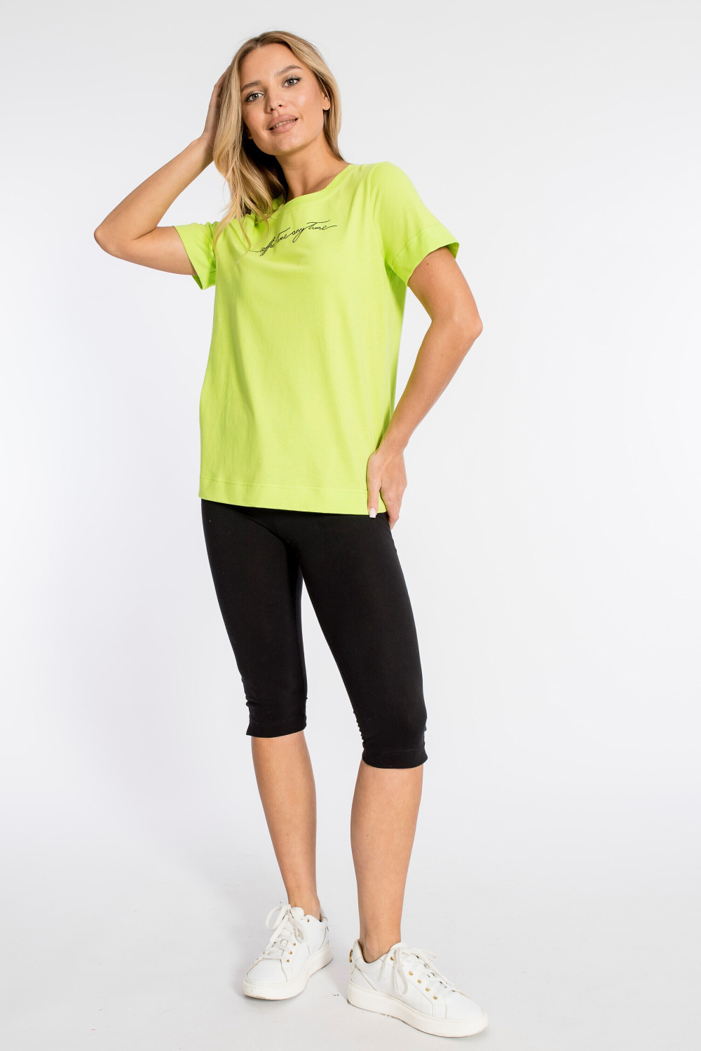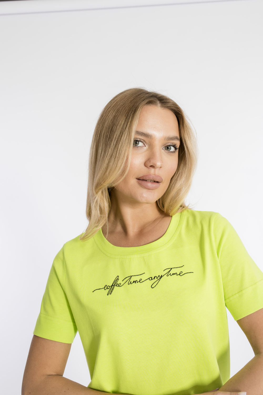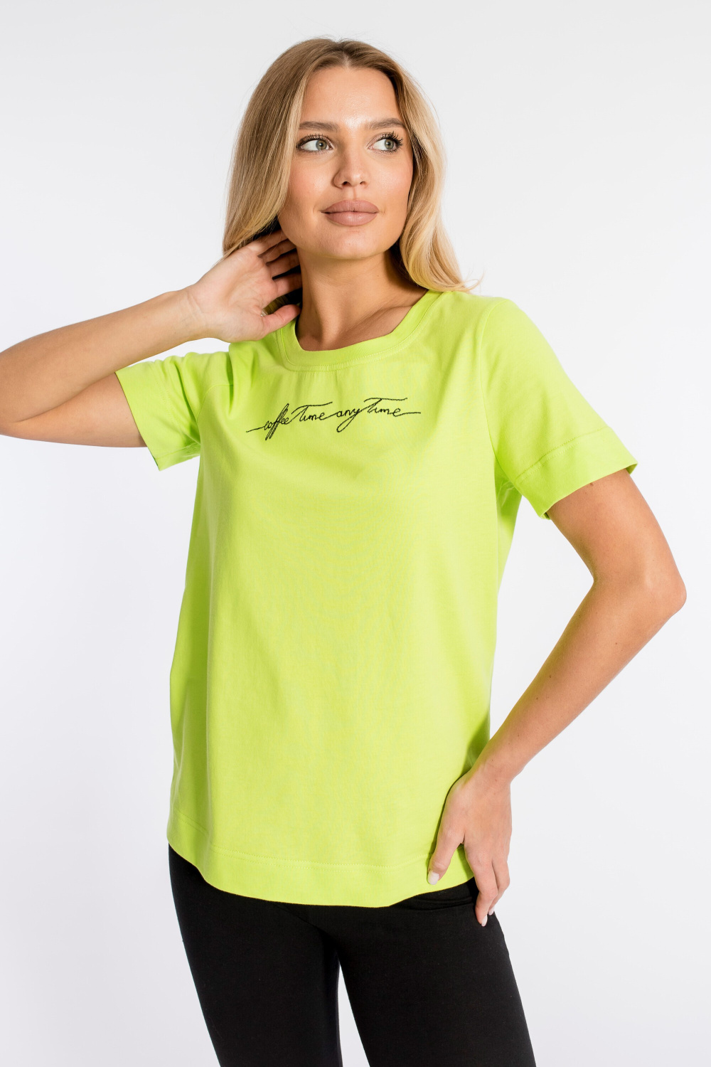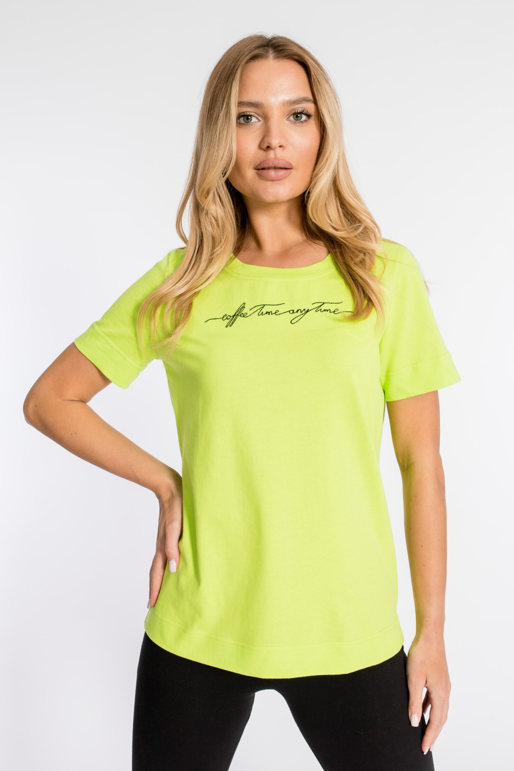 Футболка из кулирки, 100% хлопок, с коротким втачным рукавом и притачной планкой по горловине. Спереди вышивка.