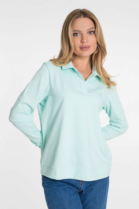 Футболка с длинным рукавом выполнена из полотна "пике" красивого ментолового цвета.