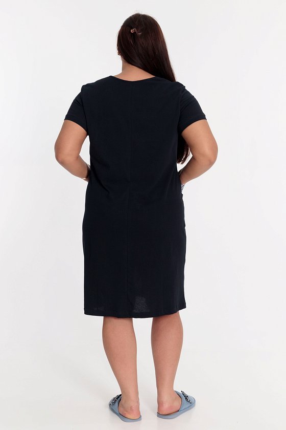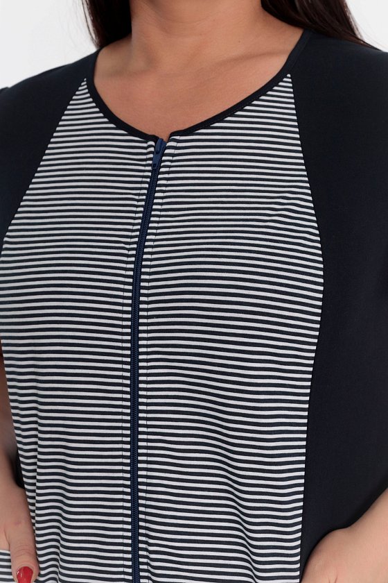 Халат выполнен из кулирки, 100% хлопок. С короткими рукавами и центральной застёжкой на молнию. По бокам расположены два кармана. Круглый вырез горловины оформлен бейкой.