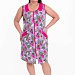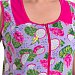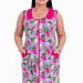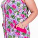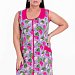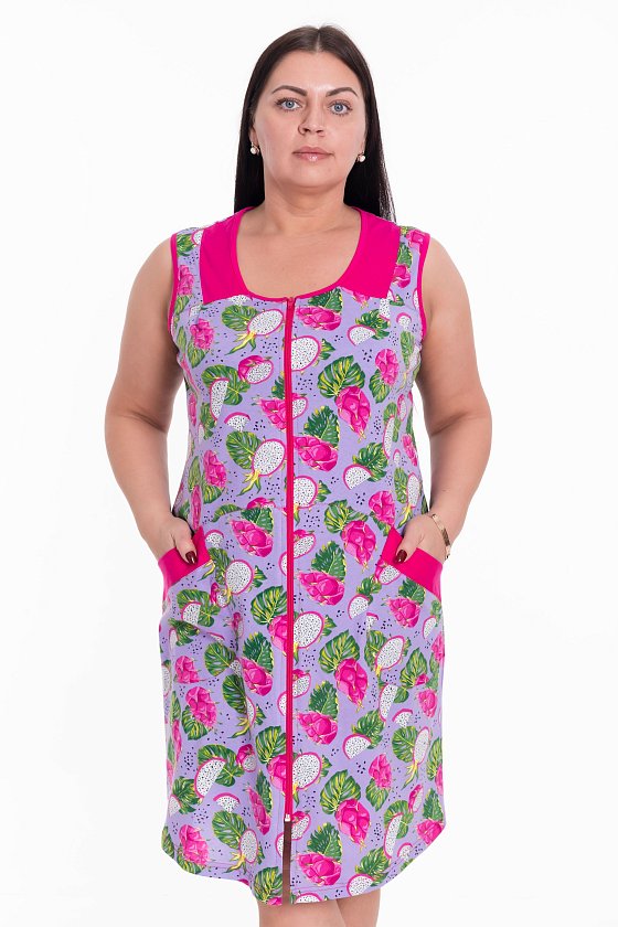 Халат выполнен из хлопкового полотна с набивным рисунком с отделкой деталями из однотонного полотна, без рукавов, с центральной застёжкой на молнию. Спереди два накладных кармана.