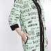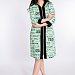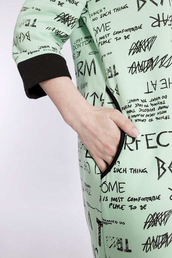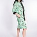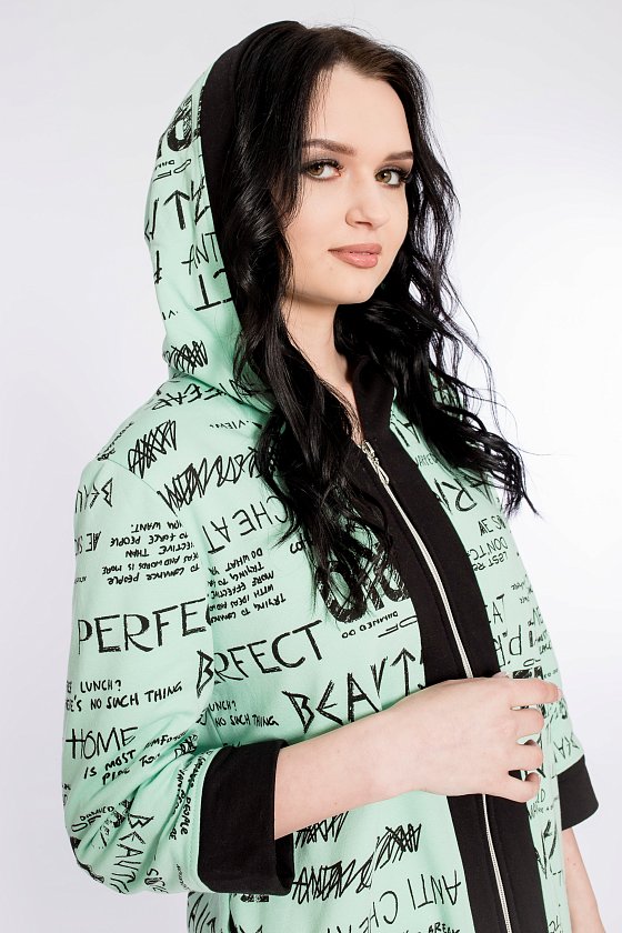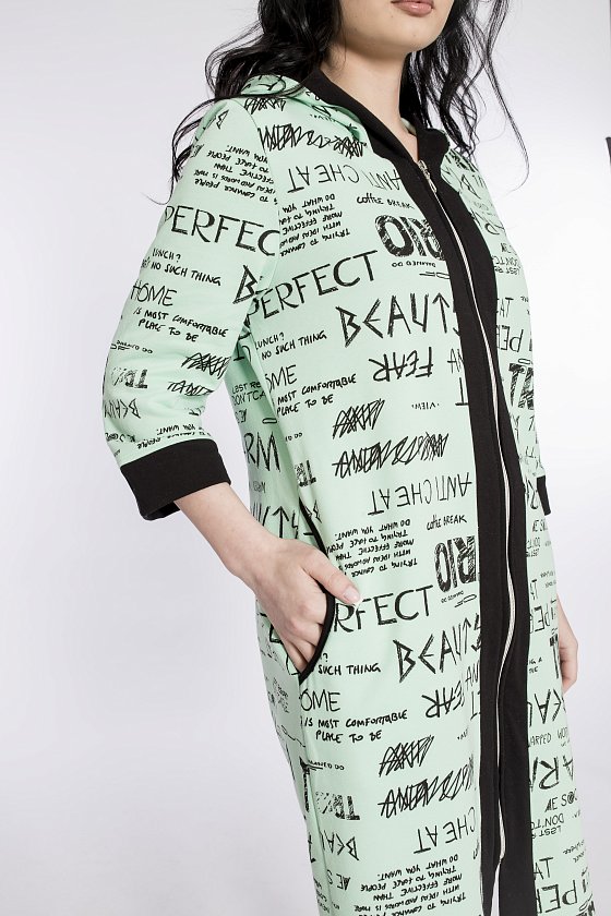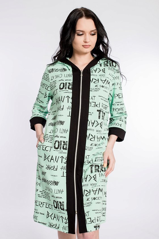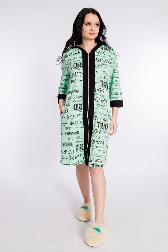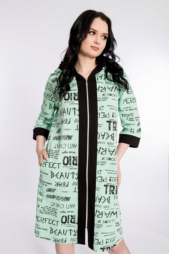 Халат выполнен из полотна с начёсом (футер двухнитка) с набивным рисунком и деталями из отднотонного полотна. Халат с капюшоном и центральной застёжкой на молнию, рукава длиной 3/4. По бокам размещены карманы.
