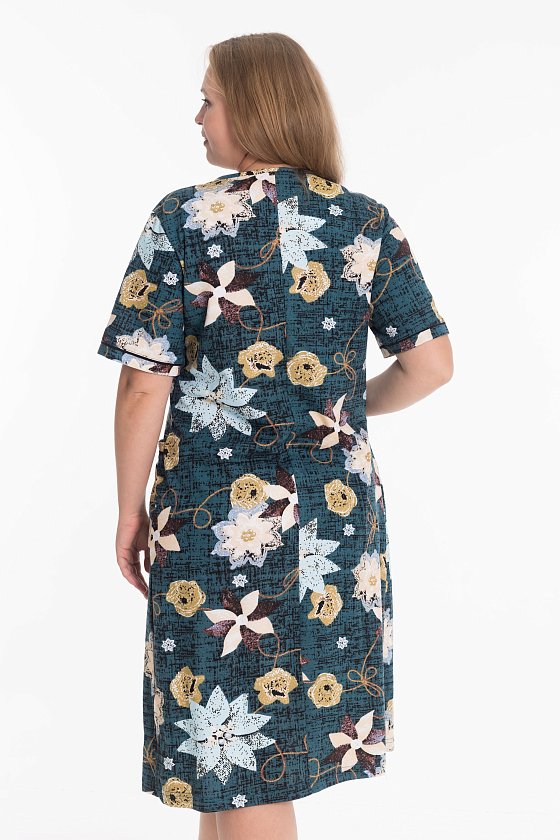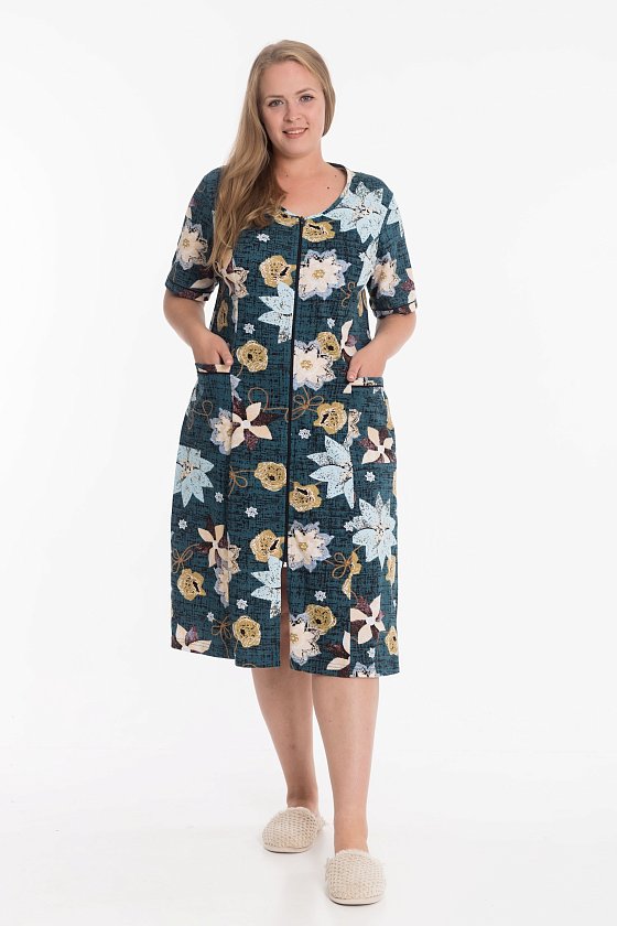 Женский халат из кулирки с набивным рисунком — удобная и практичная модель для дома. Изделие выполнено с коротким рукавом и застёжкой на молнию. На спинке расположен средний шов, обеспечивающий хорошую посадку по фигуре. Полочки оформлены рельефными линиями, между которыми и боковыми швами расположены накладные карманы. В швах притачивания планок рукавов и карманов вставлен кант, придающий халату аккуратный и стильный вид.