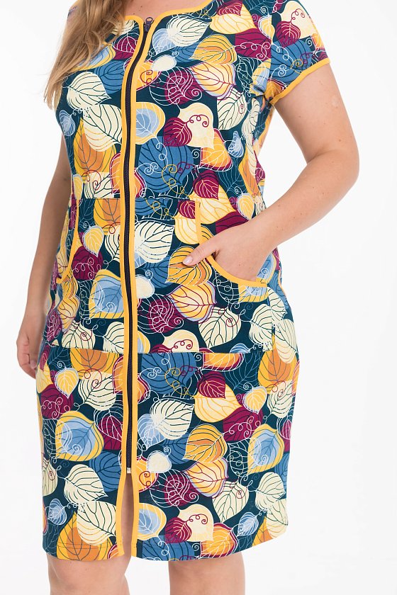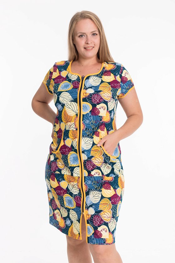 Женский халат — отличный выбор для домашнего отдыха. Он изготовлен из мягкого и комфортного хлопкового полотна с набивным рисунком, что придаёт изделию стильный вид. Халат застёгивается на молнию спереди, что обеспечивает удобство при надевании. Горловина, низ рукавов, борта и вход в карманы обработаны контрастной бейкой, что добавляет изделию аккуратности и завершает образ. Такой халат идеально подойдёт для повседневной носки дома.