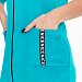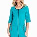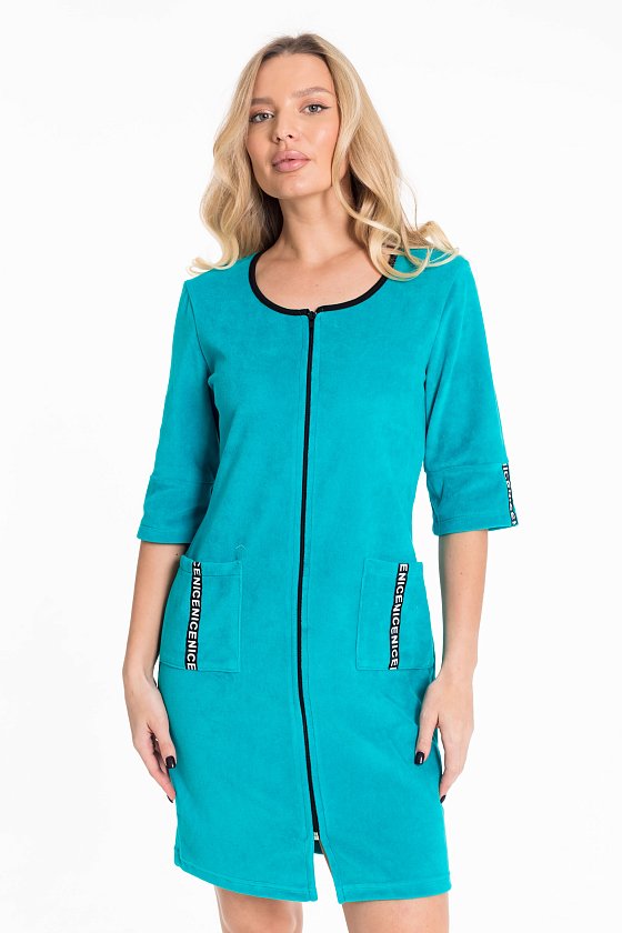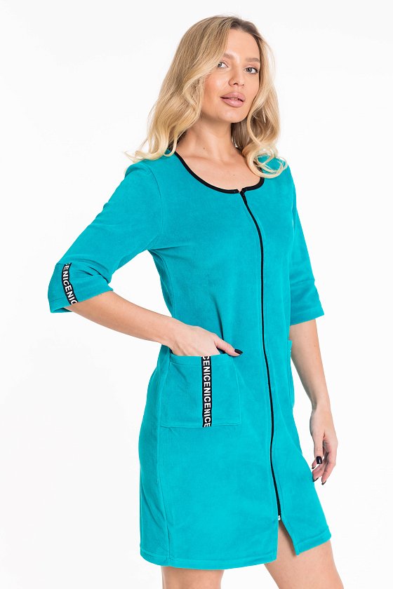 Халат выполнен из велюра. Центральная застёжка на молнию, рукава длиной 3/4. Спереди расположены два накладных кармана. На рукавах и карманах в качестве отделки настрочена репсовая лента.