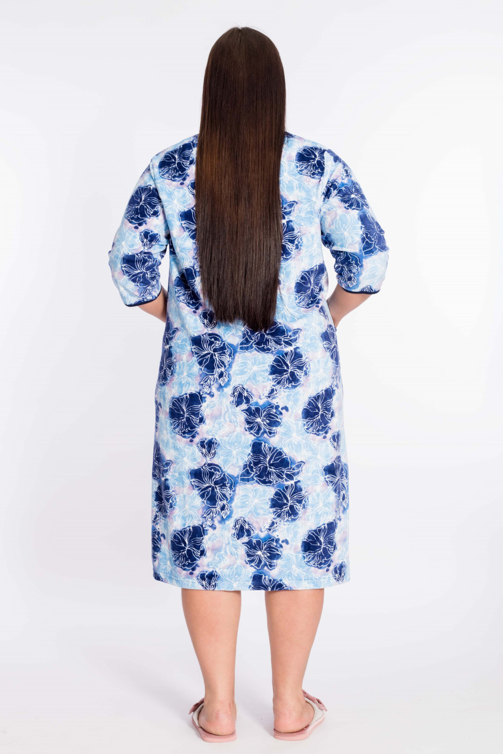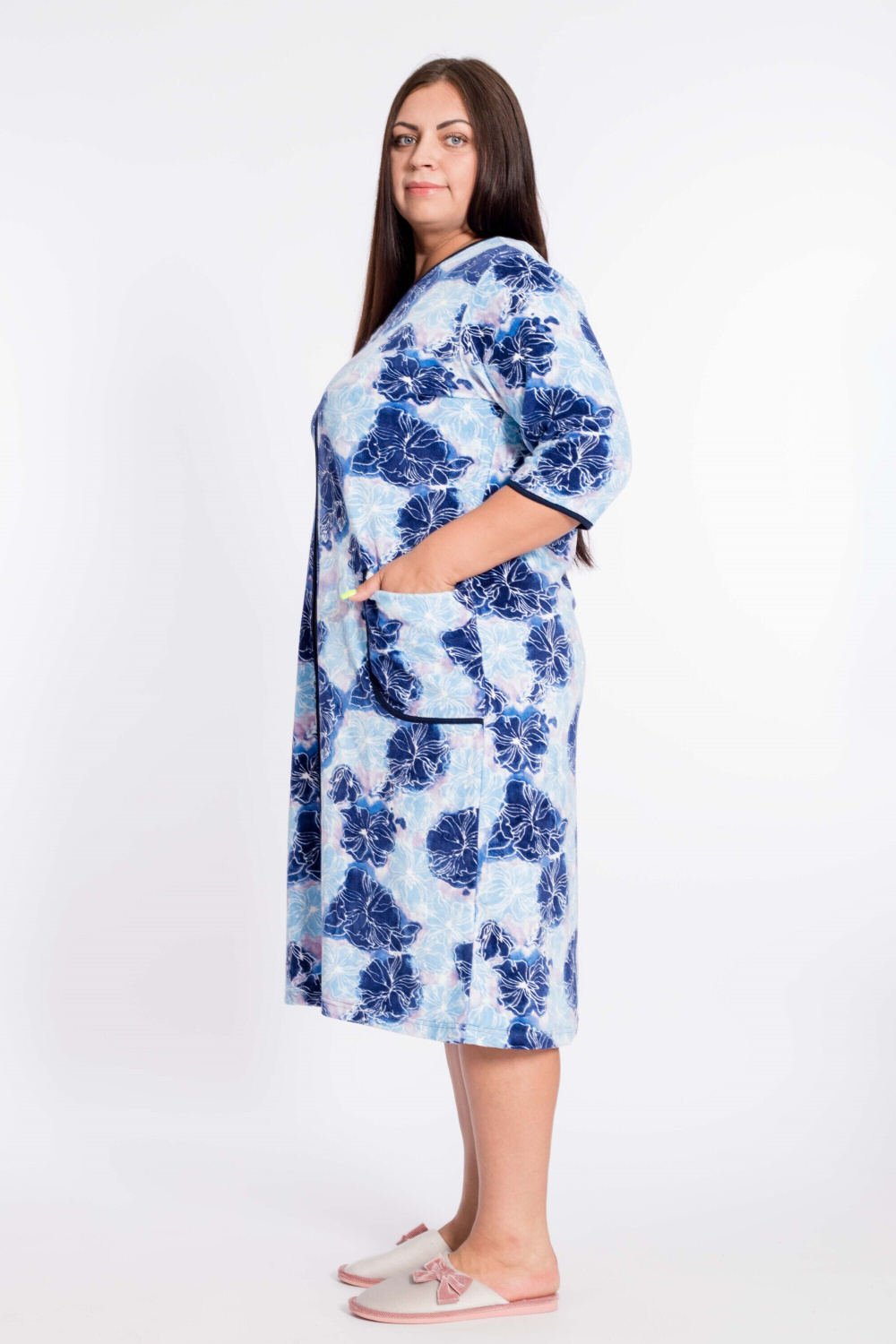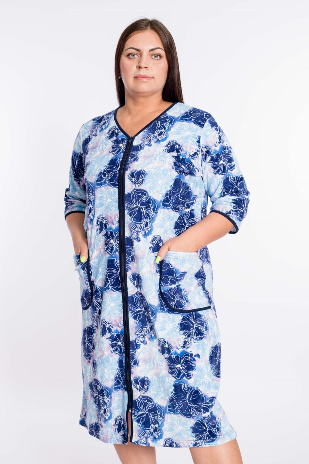 Халат женский из велюра с застёжкой на молнию. Покрой прямой, горловина с V-образным вырезом, два накладных кармана по бокам, рукав 3/4. Горловина, низ рукавов и карманы обработаны бейкой.