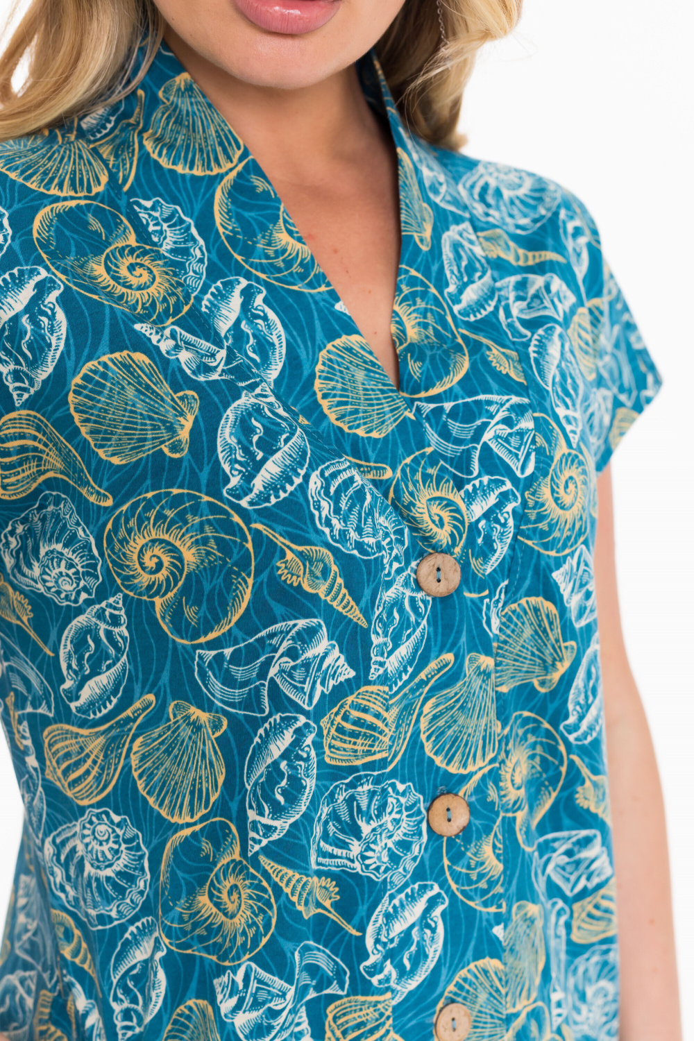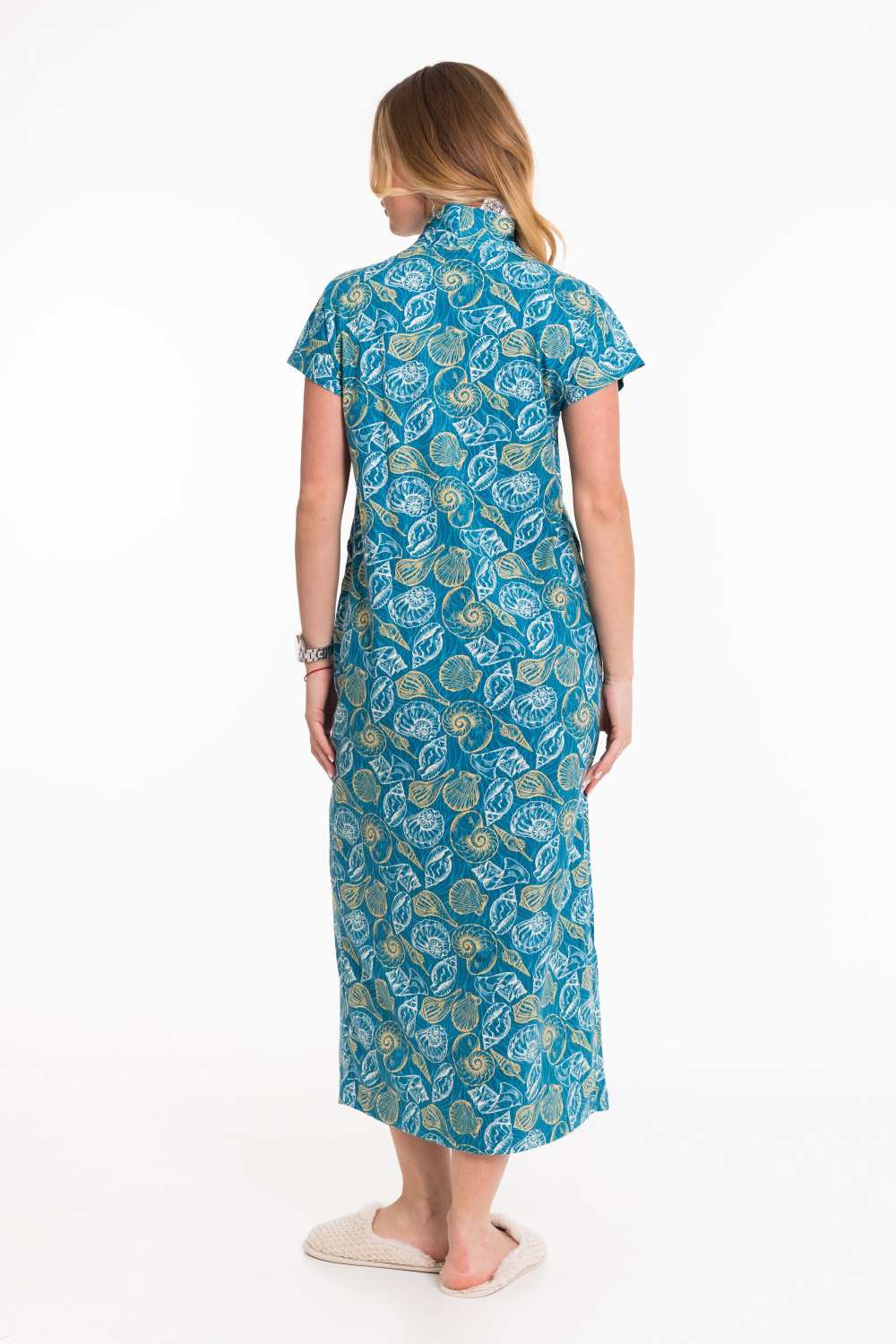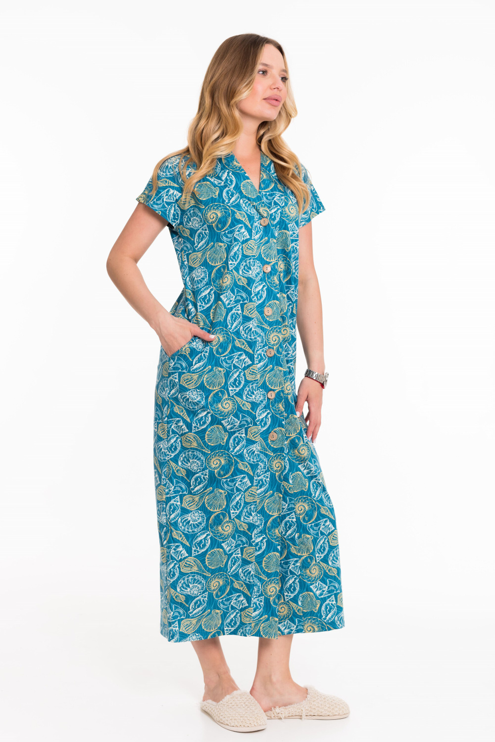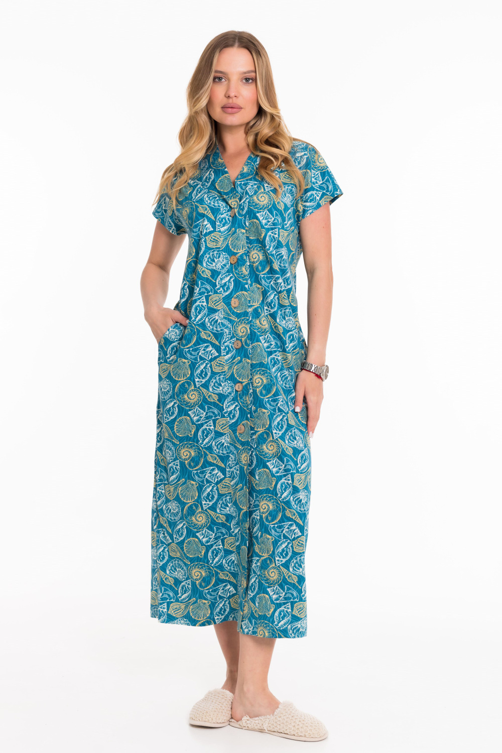 Халат выполнен из кулирки с набивным рисунком. Линия плеча спущена. Модель халата удлинённая, спереди застёгивается на пуговицы. Халат с карманами по бокам.