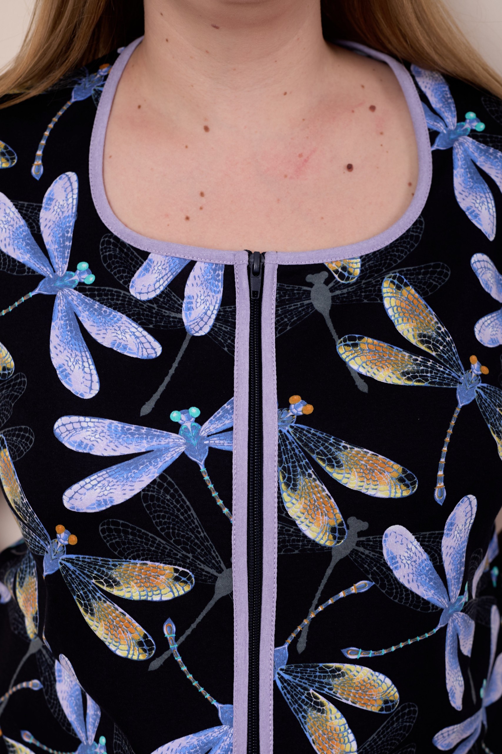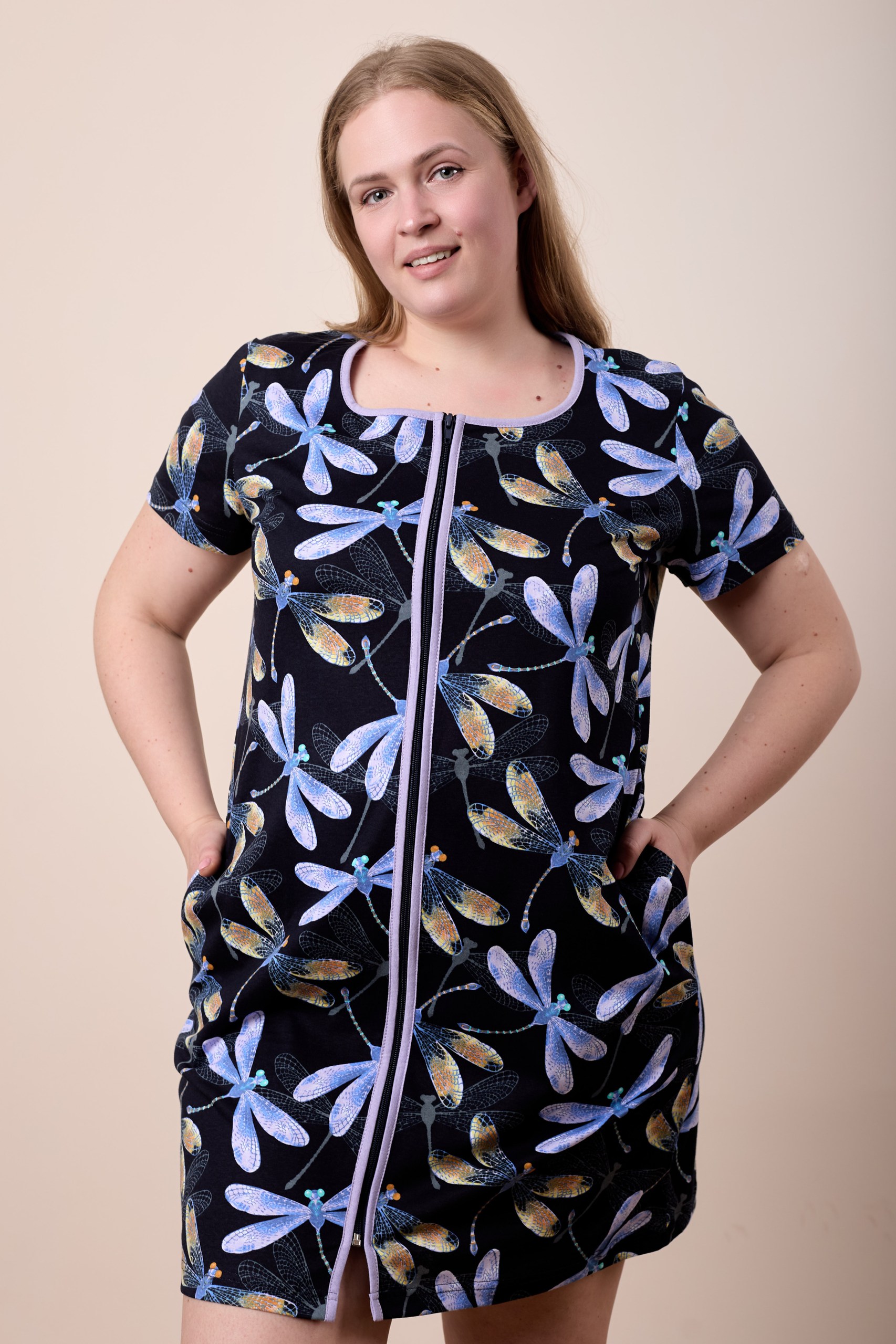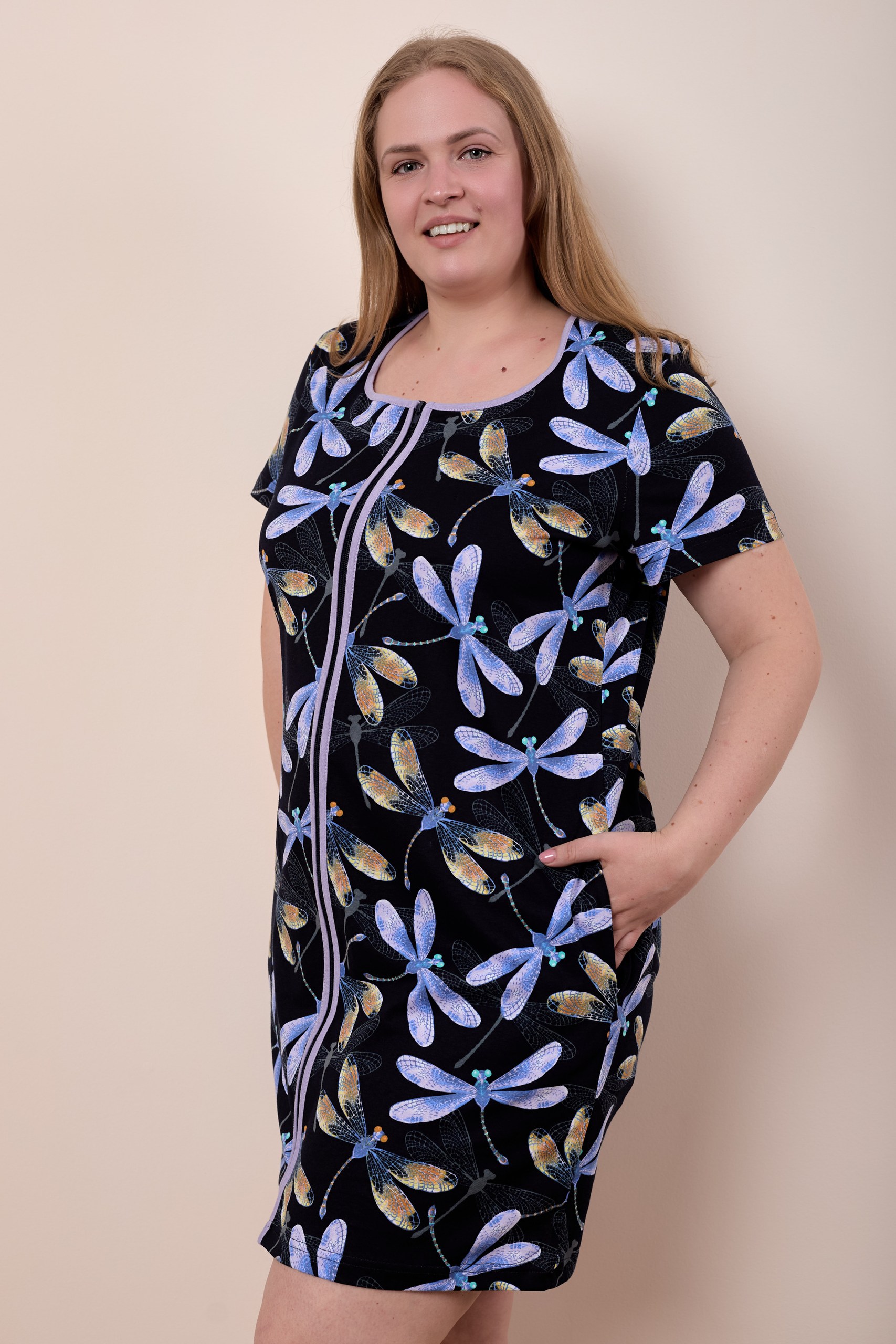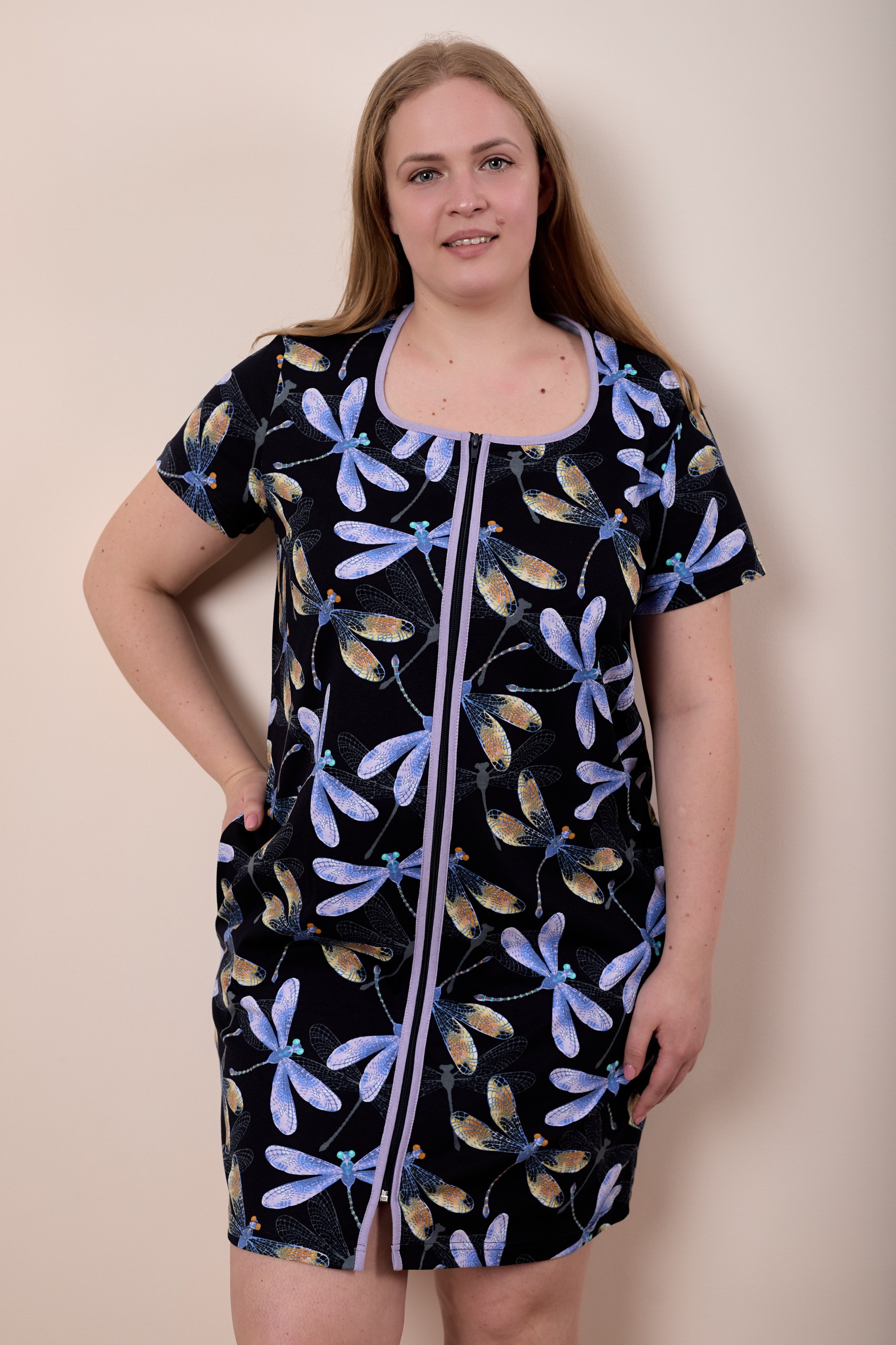 Халат из кулирки с застежкой на молнию и боковыми карманами.