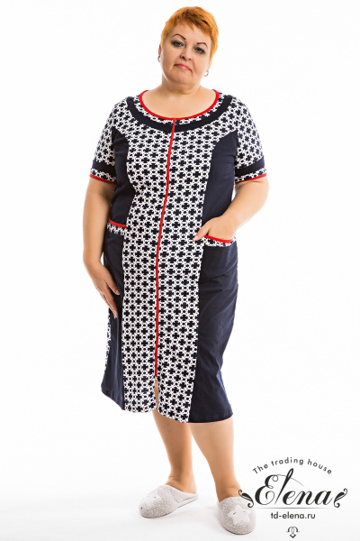 Женский халат на пуговицах выполнен из легкой хлопковой ткани с комбинацией двух расцветок. Левая полочка из однотонного полотна, с принтом. Правая полочка и спинка изделия из полотна с набивкой. Рукав короткий, горловина имеет V-образный вырез. Силуэт прямой, длина выше колена. По бокам расположены карманы. Горловина, рукава, низ изделия и вход в карманы отделаны тонкой окантовкой из полотна с набивкой.
