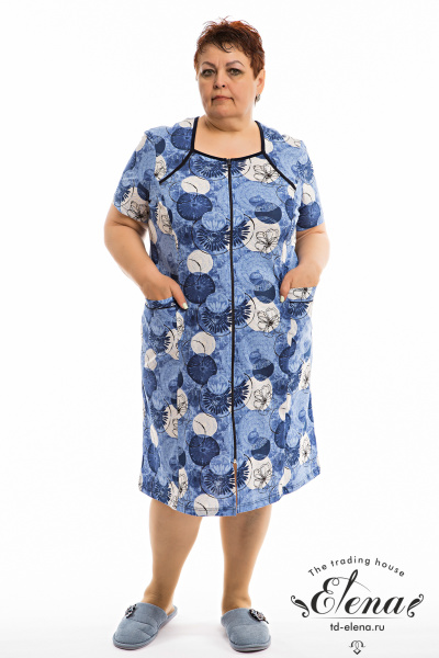 Халат выполнен из х/б полотна с набивкой. Застёжка на молнию, по бокам расположены карманы. Горловина обработана контрастной по цвету бейкой.