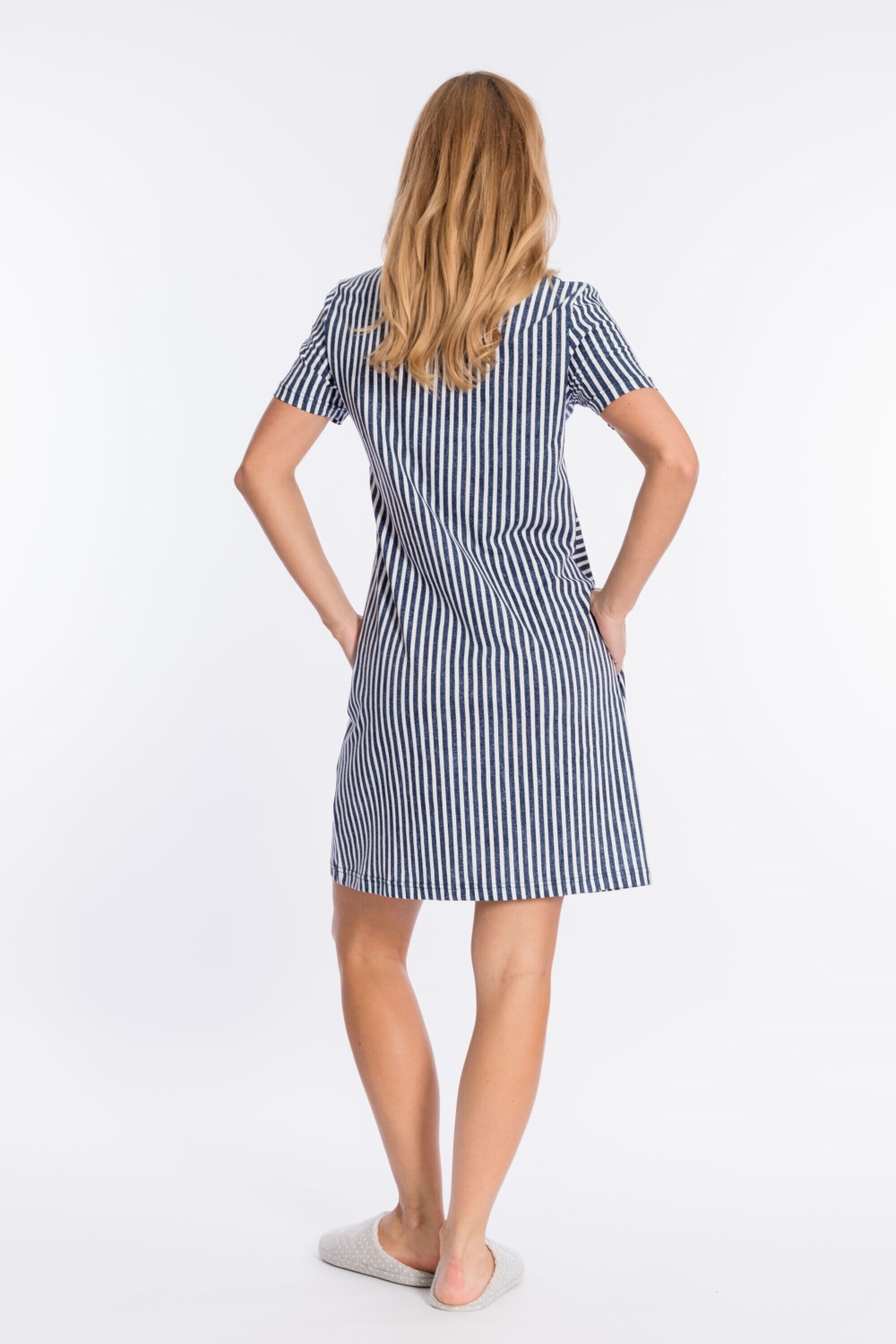 Женский халат из кулирки в полоску с коротким втачным рукавом. Спереди с принтом и застёжкой на молнию. От отрезной линии ниже талии размещены боковые карманы и сделаны складки.