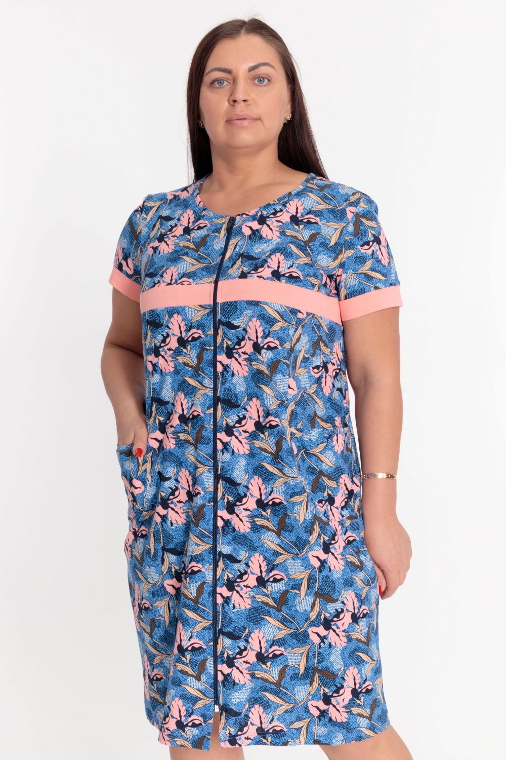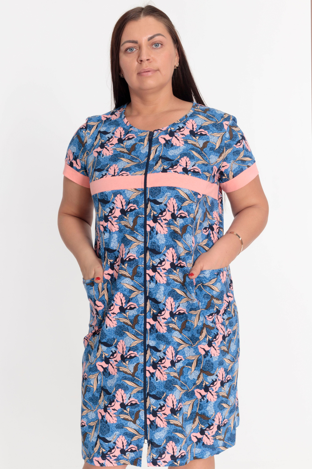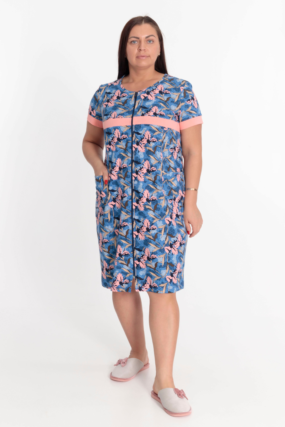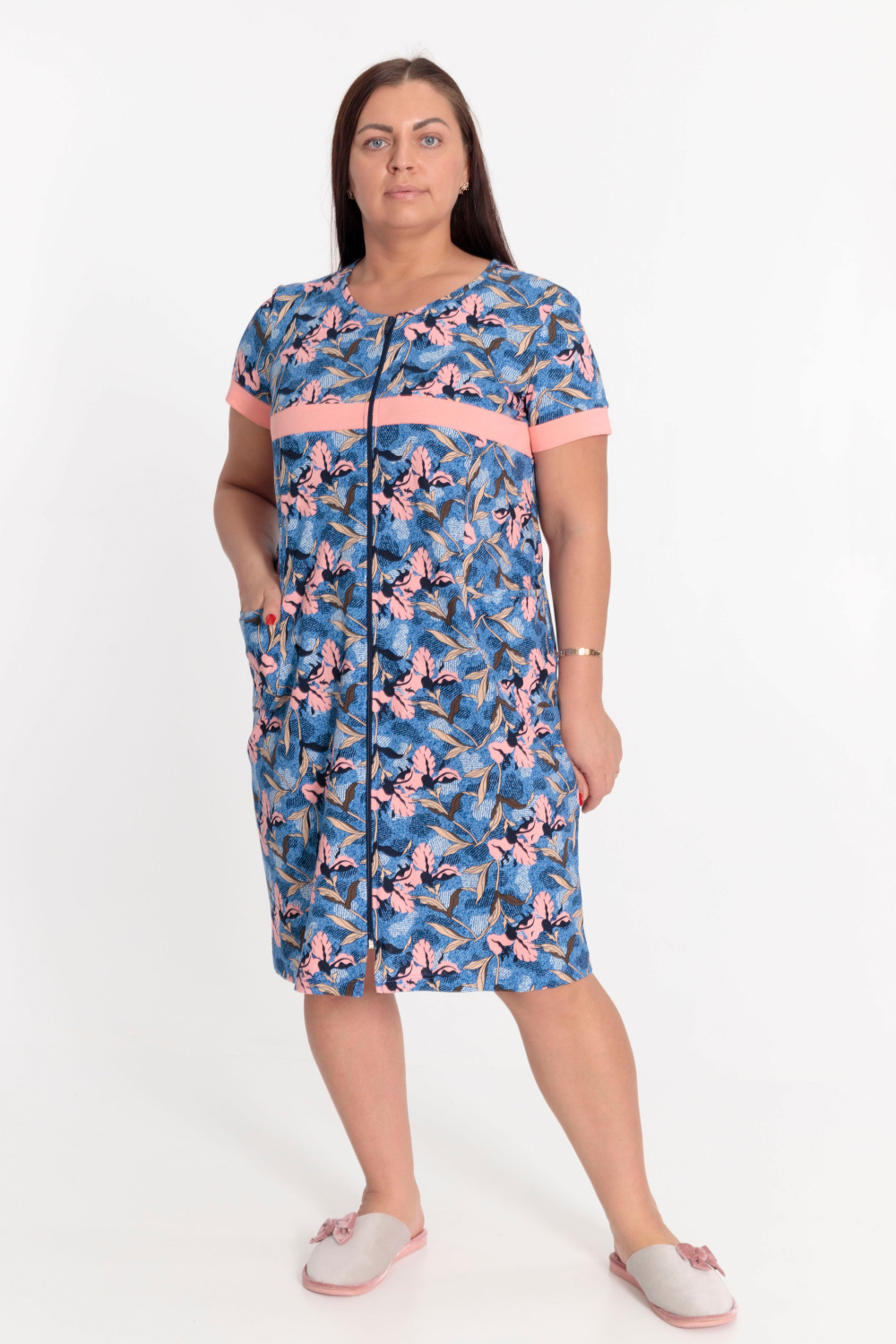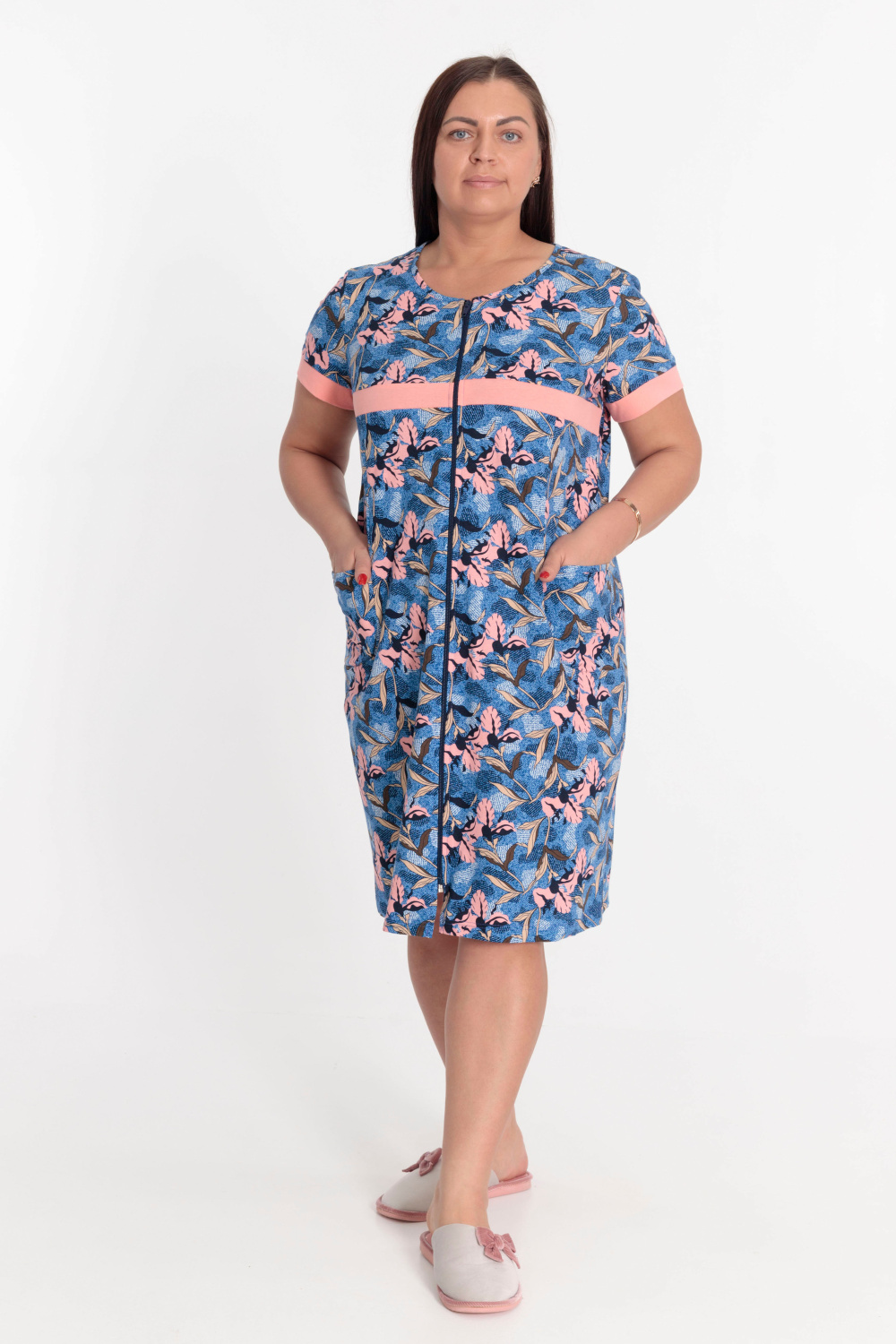 Халат с застёжкой на молнии выполнен из кулирки, 100% хлопок. Спереди и на рукавах вставки из отделочного полотна, по бокам расположены карманы.