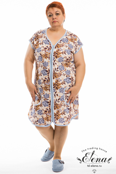 Халат женский укороченный, выполнен из набивной хлопковой ткани. Рукав цельнокроеный, горловина имеет V- образный вырез, центральная застёжка на молнию. Спереди расположены два накладных кармана. В качестве отделки бейка из однотонного полотна контрастного цвета.