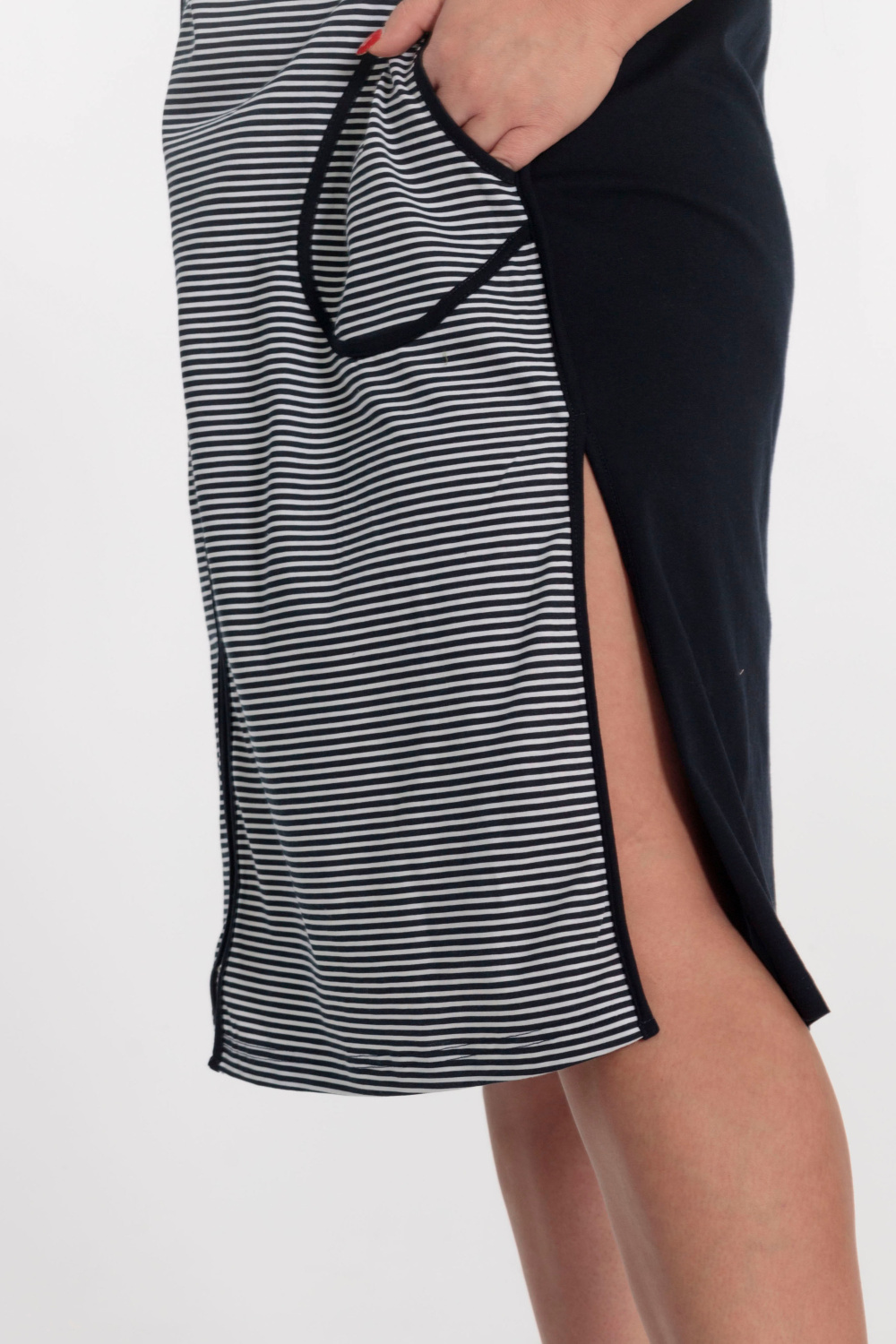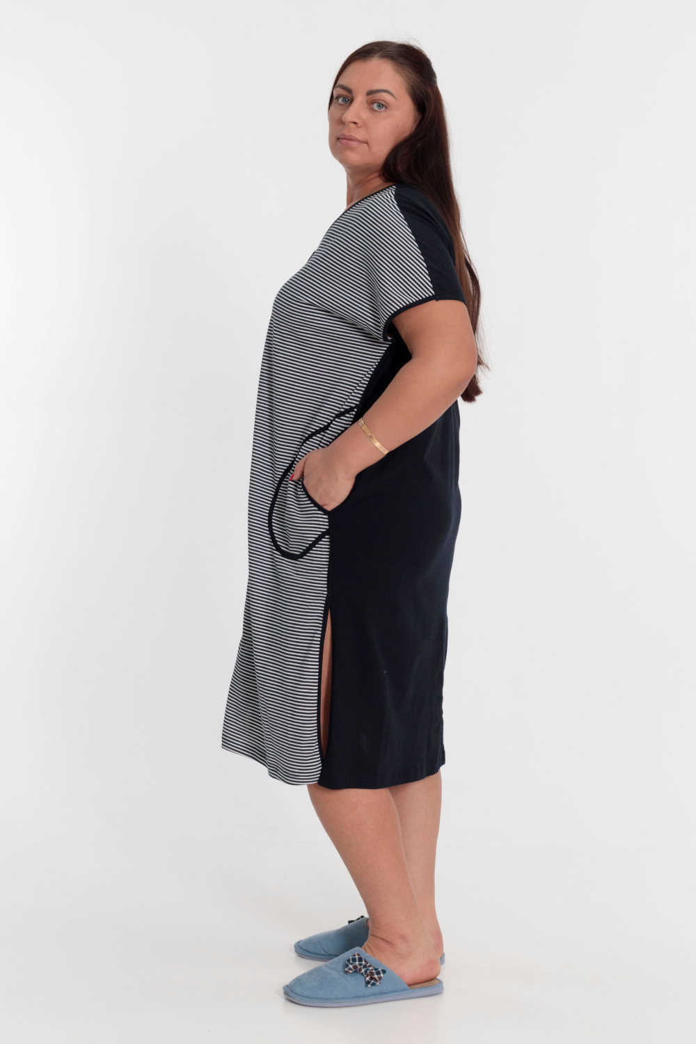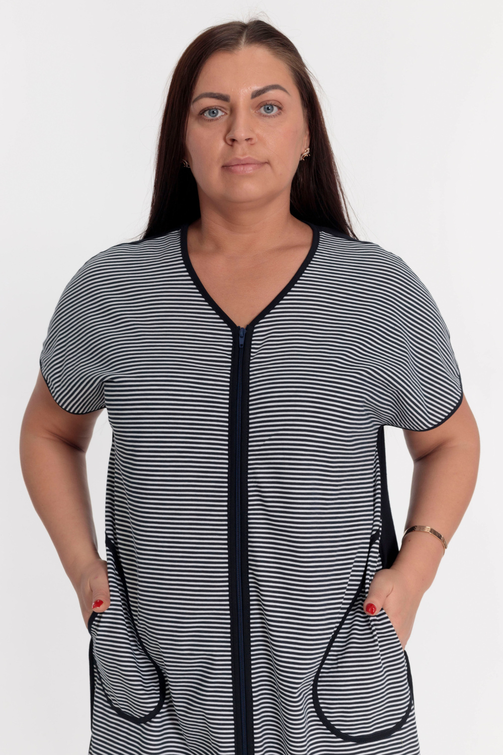 Халат выполнен из кулирки, 100% хлопок. Халат свободного силуэта, линия плеча спущена, спереди застёжка на молнию. По бокам расположены карманы. Детали халата оформлены бейкой, в боковых швах разрезы.