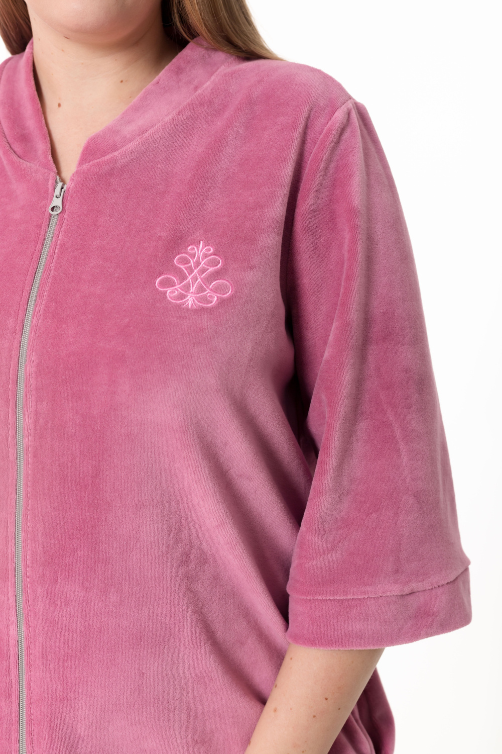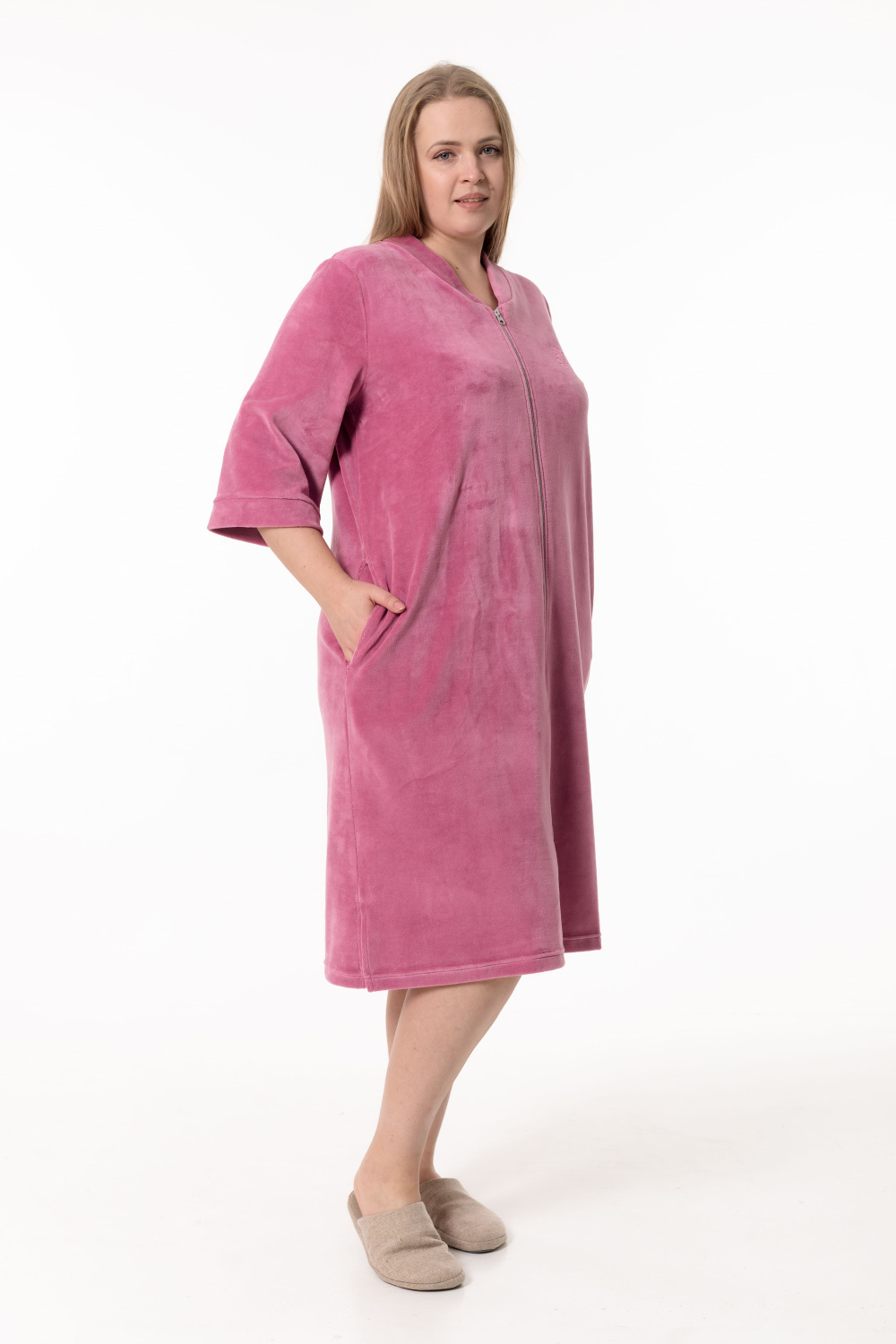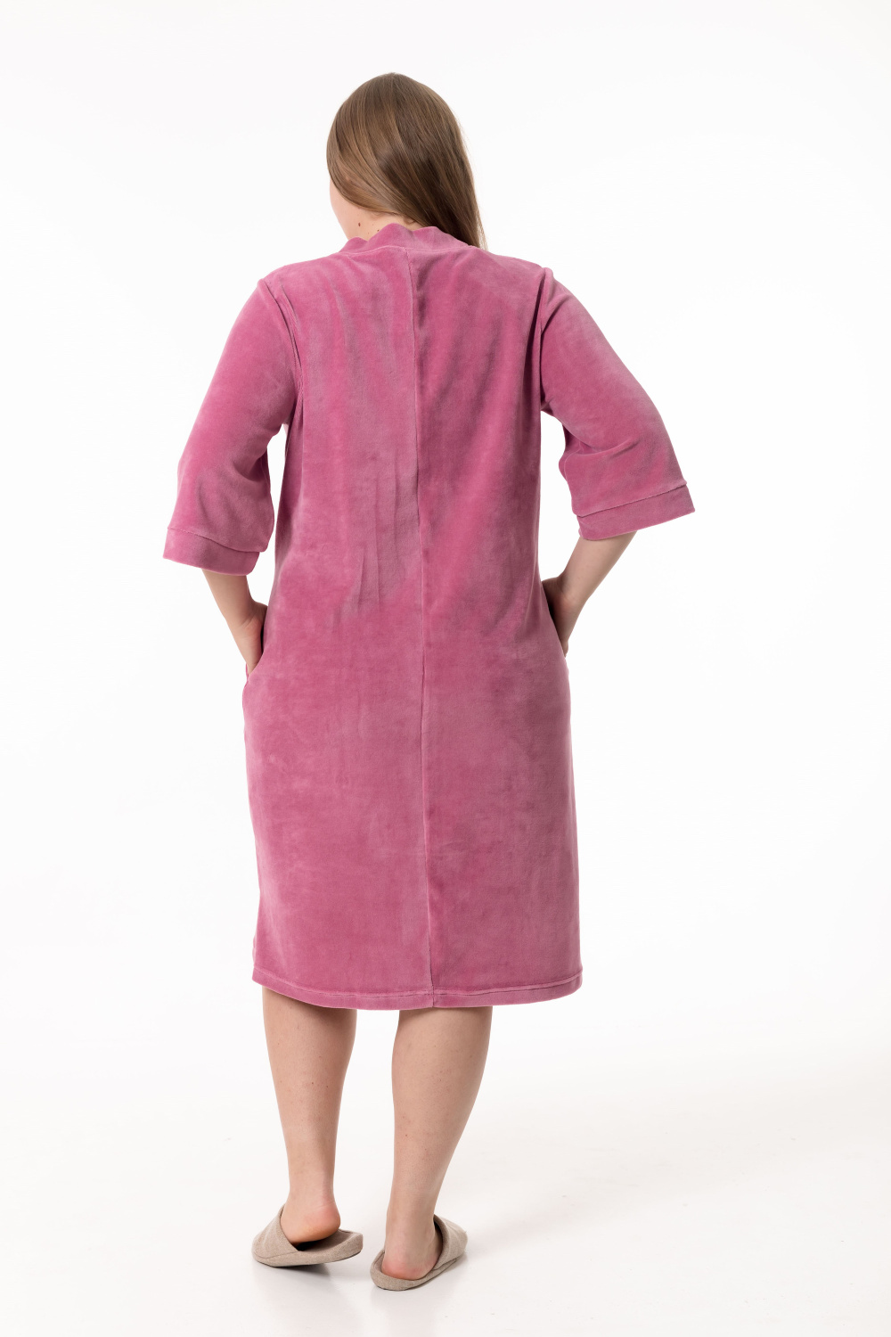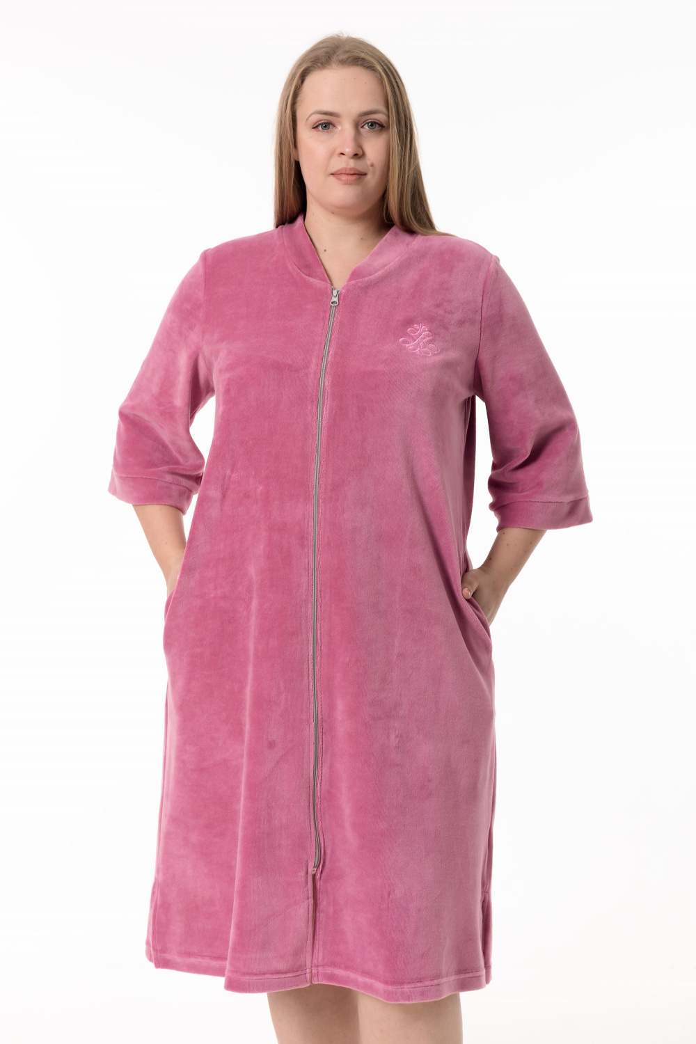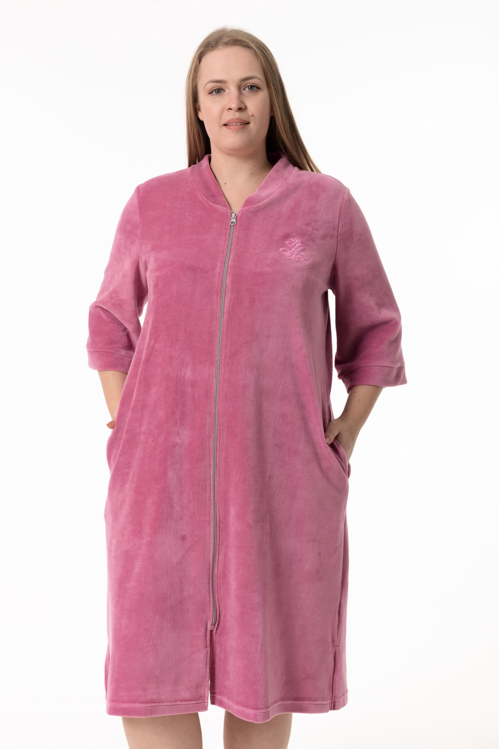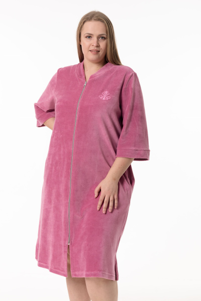 Женский халат — отличный выбор для домашнего отдыха. Он выполнен из мягкого и приятного на ощупь однотонного велюра благородного цвета сухая роза, который обеспечивает комфорт и тепло.