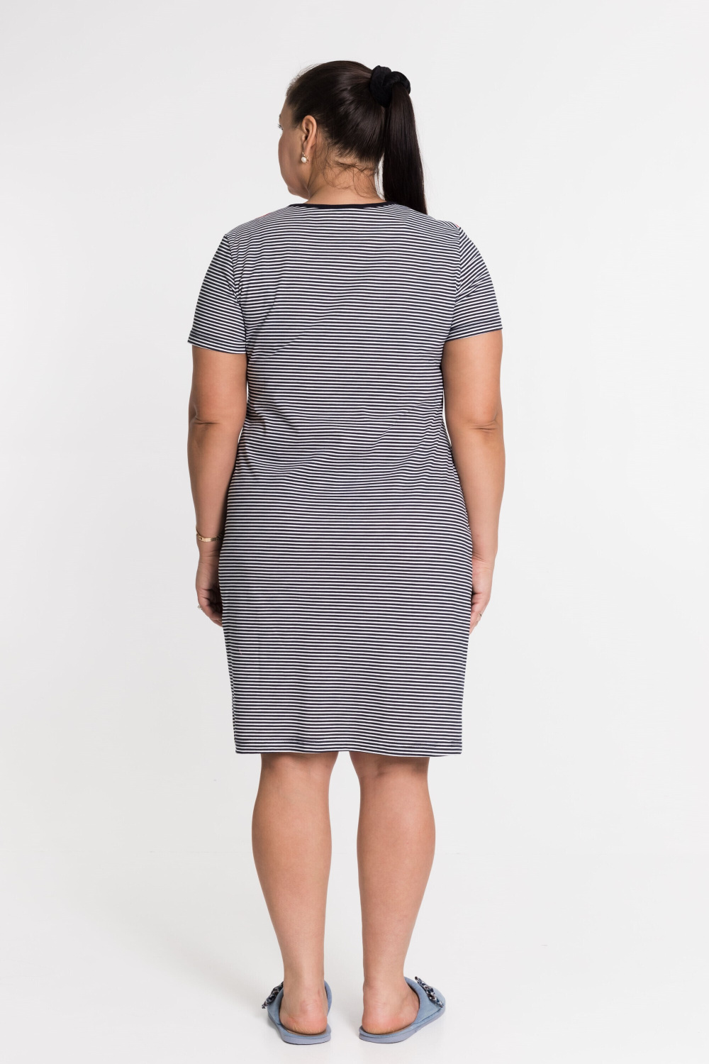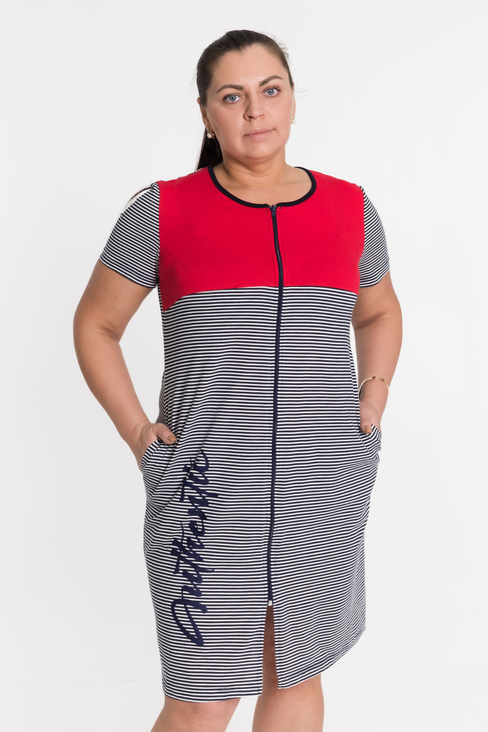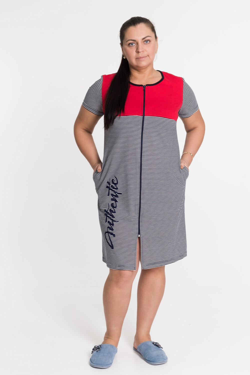Халат с застёжкой на молнию выполнен из кулирки, 100% хлопок. С правой стороны нанесён принт. Вырез горловины обработан бейкой, в боковых швах расположены карманы.