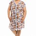 Халат женский укороченный, выполнен из набивной хлопковой ткани. Рукав цельнокроеный, горловина имеет V- образный вырез, центральная застёжка на молнию. Спереди расположены два накладных кармана. В качестве отделки бейка из однотонного полотна контрастного цвета.