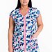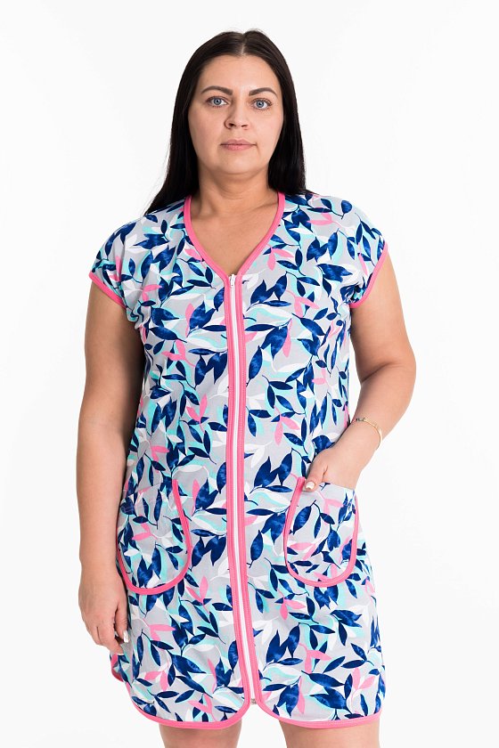 Халат женский укороченный, выполнен из набивной хлопковой ткани. Рукав цельнокроеный, горловина имеет V- образный вырез, центральная застёжка на молнию. Спереди расположены два накладных кармана. В качестве отделки бейка из однотонного полотна контрастного цвета.