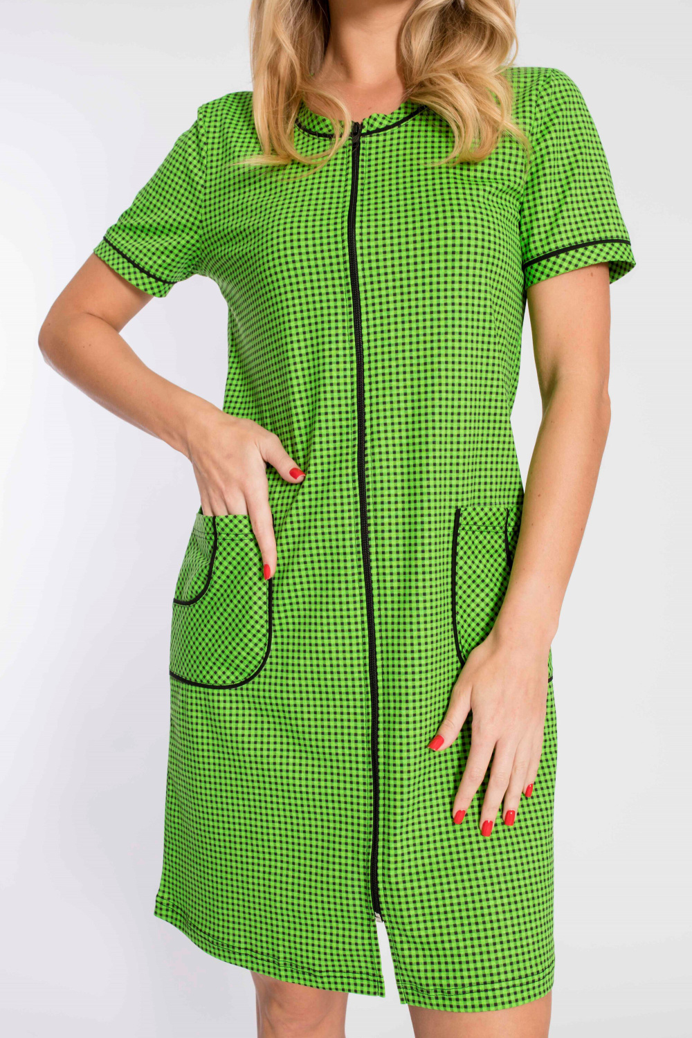 Халат с застёжкой на молнию выполнен из кулирки, 100% хлопок. Рукава короткие, спереди два накладных кармана. Вырез горловины, низ рукавов и карманы украшены отделочным кантом.