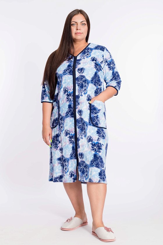 Халат женский из велюра с застёжкой на молнию. Покрой прямой, горловина с V-образным вырезом, два накладных кармана по бокам, рукав 3/4. Горловина, низ рукавов и карманы обработаны бейкой.