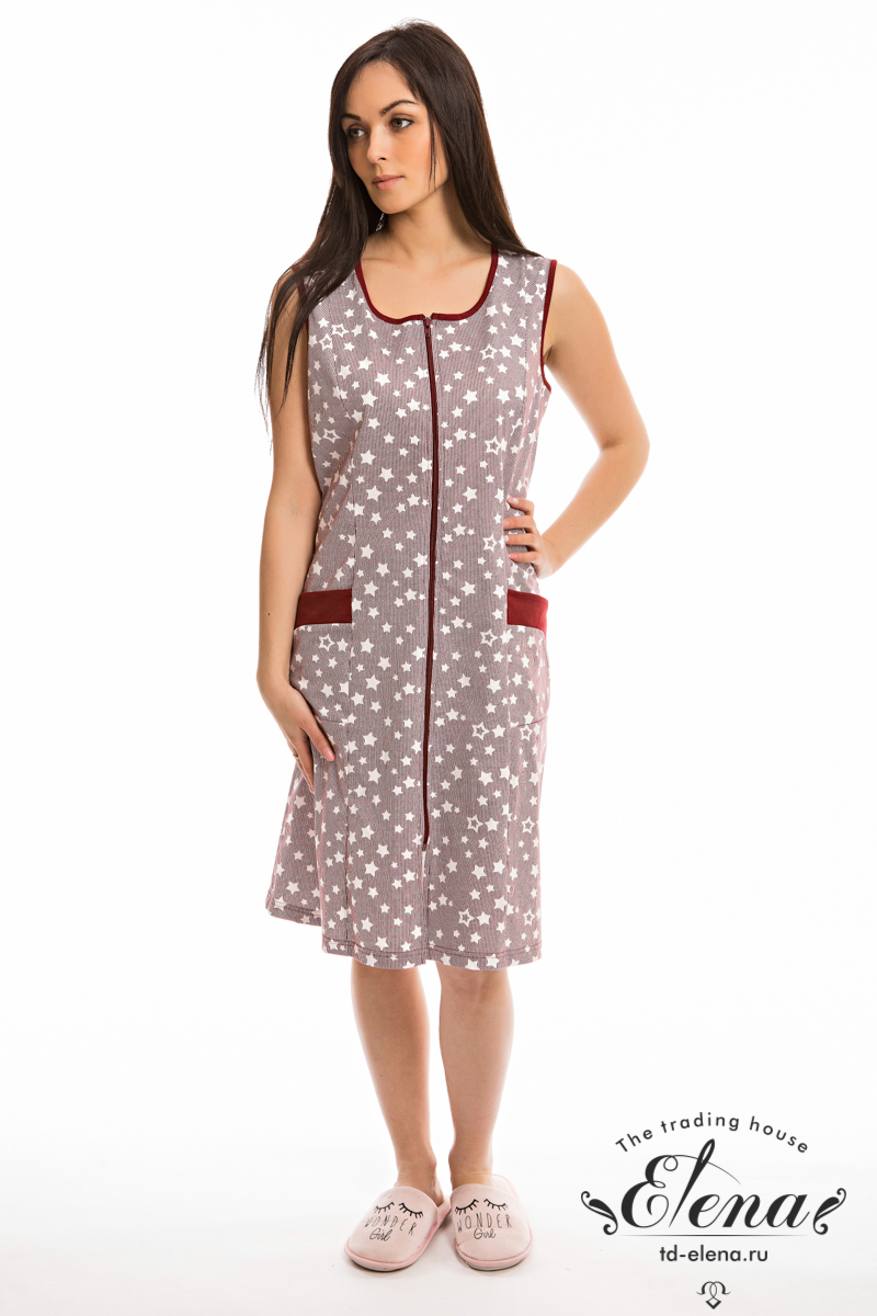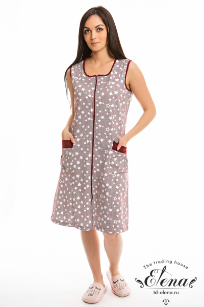 Халат без рукавов с центральной застёжкой на молнию. По бокам расположены два накладных кармана. Горловина, проймы и карманы обработаны бейкой из контрастного по цвету полотна.