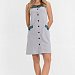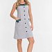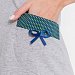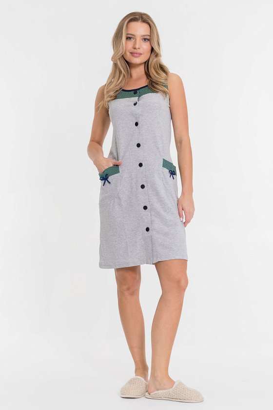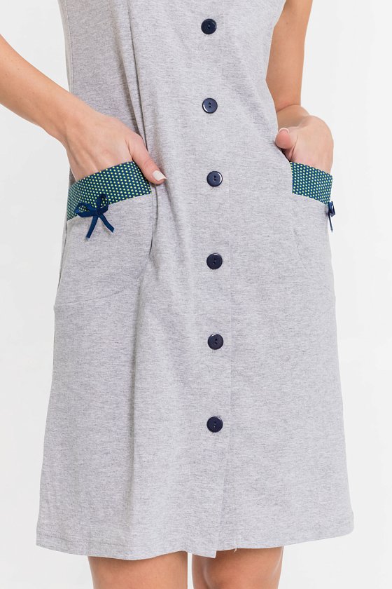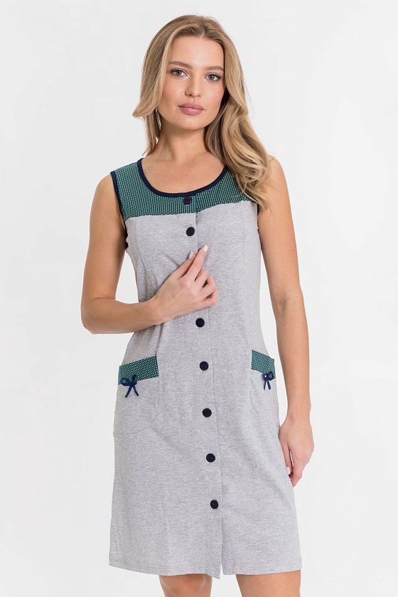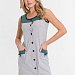 Молодёжный халат без рукавов выполнен из хлопковой ткани двух контрастных расцветок. Центральная застёжка на пуговицы, кокетка и планки на карманах из отделочного полотна. Карманы украшены декоративными бантиками.