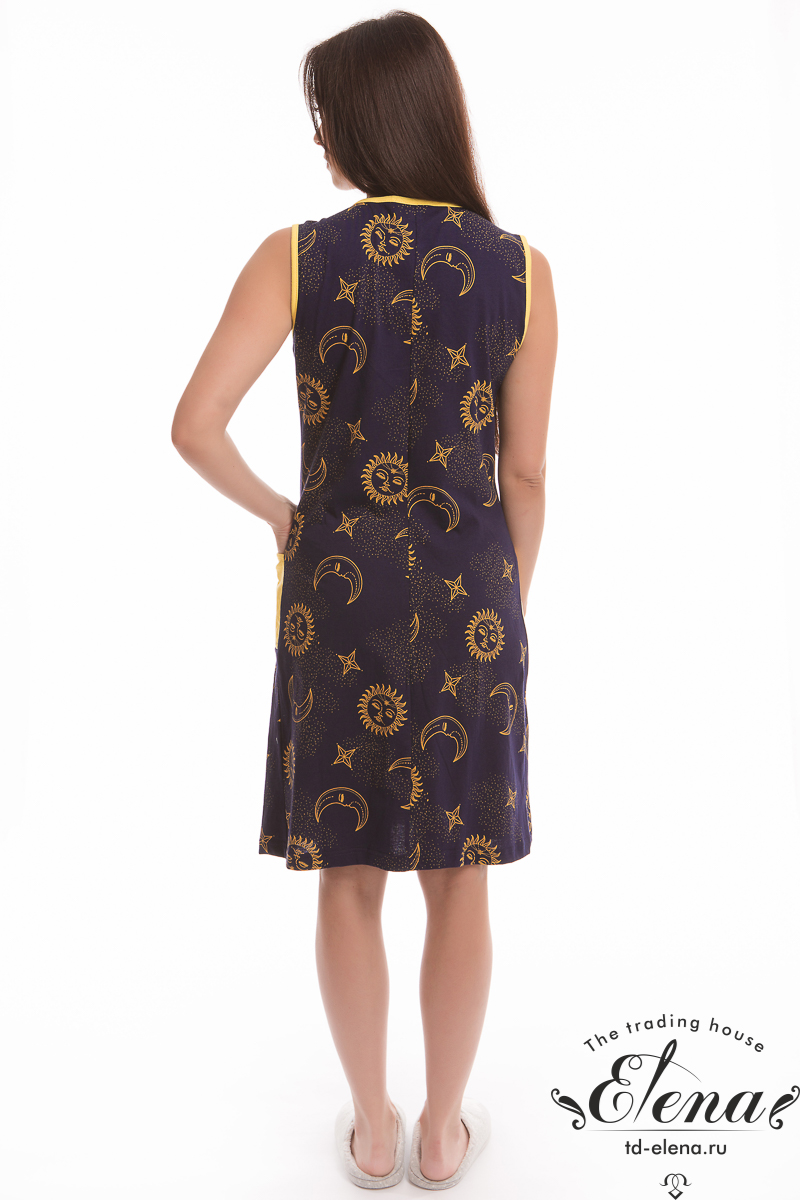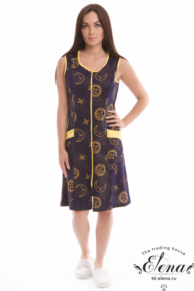 Халат без рукавов с центральной застёжкой на молнию. По бокам расположены два накладных кармана. Горловина, проймы и карманы обработаны бейкой из контрастного по цвету полотна.